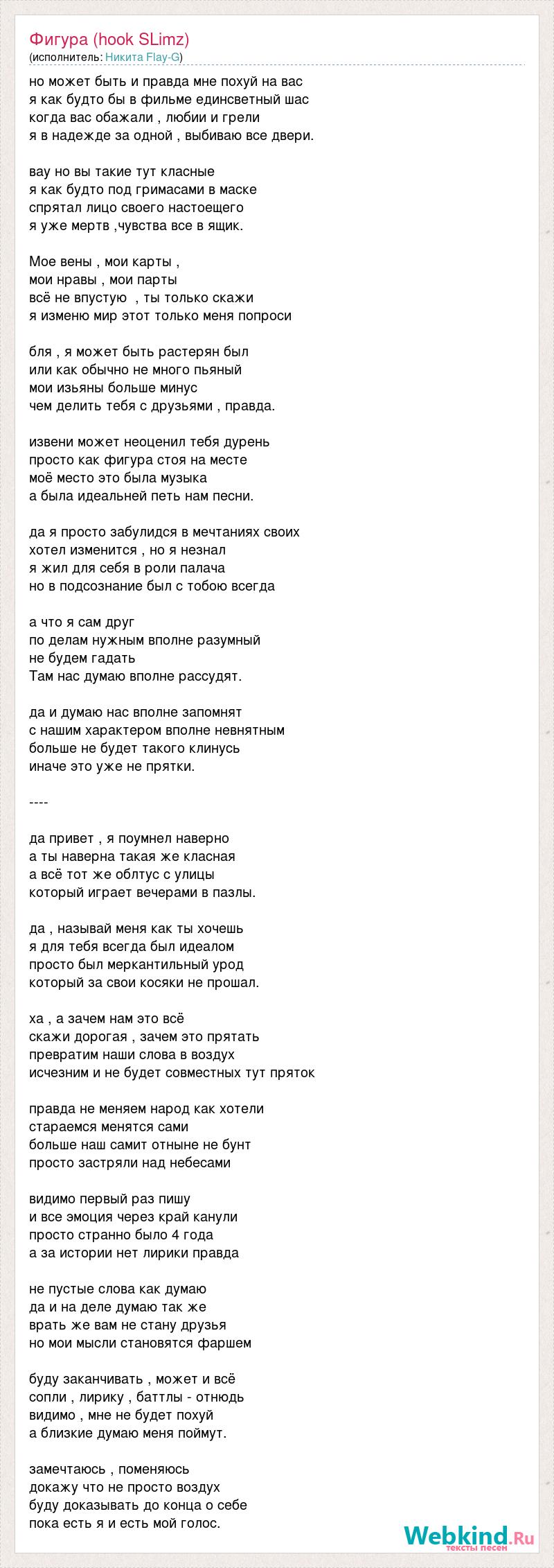 но может быть и правда мне похуй на вас я как будто бы в фильме единсветный шас когда вас обажали , любии и грели я в надежде за одной , выбиваю все двери. вау но вы такие тут класные я как будто под гримасами в маске спрятал лицо своего настоещего я уже мертв ,чувства все в ящик. Мое вены , мои карты , мои нравы , мои парты всё не впустую , ты только скажи я изменю мир этот только меня попроси бля , я может быть растерян был или как обычно не много пьяный мои изьяны больше минус чем делить тебя с друзьями , правда. извени может неоценил тебя дурень просто как фигура стоя на месте моё место это была музыка а была идеальней петь нам песни. да я просто забулидся в мечтаниях своих хотел изменится , но я незнал я жил для себя в роли палача но в подсознание был с тобою всегда а что я сам друг по делам нужным вполне разумный не будем гадать Там нас думаю вполне рассудят. да и думаю нас вполне запомнят с нашим характером вполне невнятным больше не будет такого клинусь иначе это уже не прятки. ---- да привет , я поумнел наверно а ты наверна такая же класная а всё тот же облтус с улицы который играет вечерами в пазлы. да , называй меня как ты хочешь я для тебя всегда был идеалом просто был меркантильный урод который за свои косяки не прошал. ха , а зачем нам это всё скажи дорогая , зачем это прятать превратим наши слова в воздух исчезним и не будет совместных тут пряток правда не меняем народ как хотели стараемся менятся сами больше наш самит отныне не бунт просто застряли над небесами видимо первый раз пишу и все эмоция через край канули просто странно было 4 года а за истории нет лирики правда не пустые слова как думаю да и на деле думаю так же врать же вам не стану друзья но мои мысли становятся фаршем буду заканчивать , может и всё сопли , лирику , баттлы - отнюдь видимо , мне не будет похуй а близкие думаю меня поймут. замечтаюсь , поменяюсь докажу что не просто воздух буду доказывать до конца о себе пока есть я и есть мой голос.