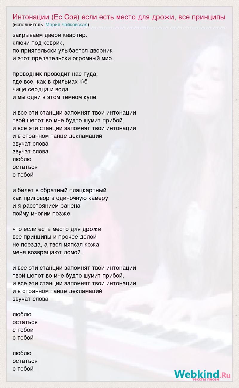 Главная→Исполнители→Мария Чайковская→Интонации (Ес Соя) если есть место для дрожи, все принципы и прочее долой, не по