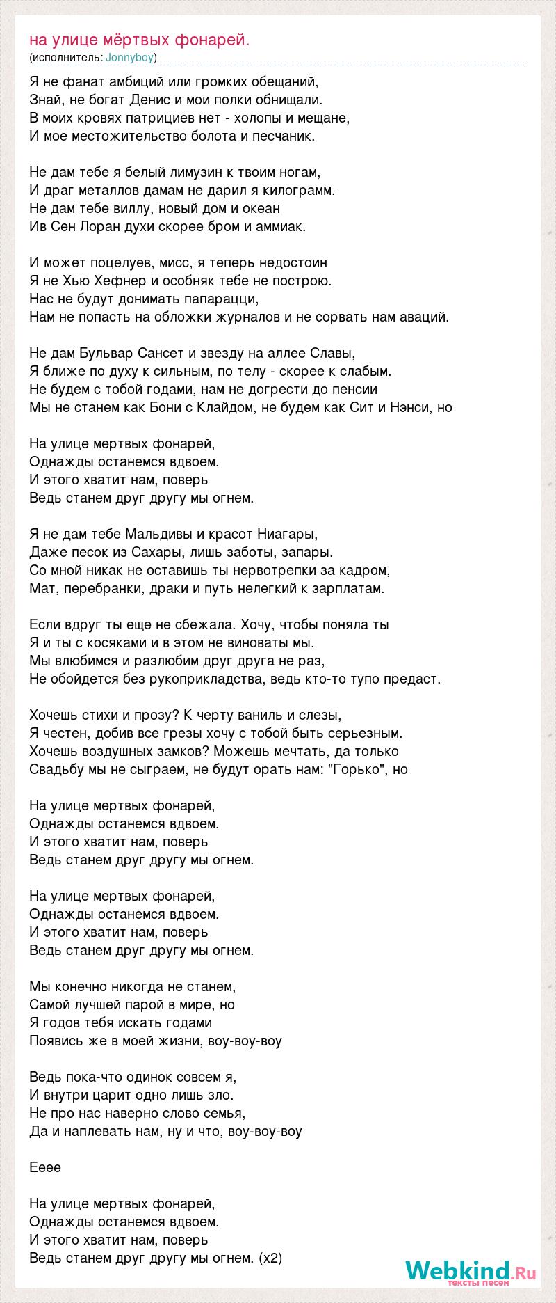 Я не фанат амбиций или громких обещаний, Знай, не богат Денис и мои полки обнищали. В моих кровях патрициев нет - холопы и мещане, И мое местожительство болота и песчаник. Не дам тебе я белый лимузин к твоим ногам, И драг металлов дамам не дарил я килограмм. Не дам тебе виллу, новый дом и океан Ив Сен Лоран духи скорее бром и аммиак. И может поцелуев, мисс, я теперь недостоин Я не Хью Хефнер и особняк тебе не построю. Нас не будут донимать папарацци, Нам не попасть на обложки журналов и не сорвать нам аваций. Не дам Бульвар Сансет и звезду на аллее Славы, Я ближе по духу к сильным, по телу - скорее к слабым. Не будем с тобой годами, нам не догрести до пенсии Мы не станем как Бони с Клайдом, не будем как Сит и Нэнси, но На улице мертвых фонарей, Однажды останемся вдвоем. И этого хватит нам, поверь Ведь станем друг другу мы огнем. Я не дам тебе Мальдивы и красот Ниагары, Даже песок из Сахары, лишь заботы, запары. Со мной никак не оставишь ты нервотрепки за кадром, Мат, перебранки, драки и путь нелегкий к зарплатам. Если вдруг ты еще не сбежала. Хочу, чтобы поняла ты Я и ты с косяками и в этом не виноваты мы. Мы влюбимся и разлюбим друг друга не раз, Не обойдется без рукоприкладства, ведь кто-то тупо предаст. Хочешь стихи и прозу? К черту ваниль и слезы, Я честен, добив все грезы хочу с тобой быть серьезным. Хочешь воздушных замков? Можешь мечтать, да только Свадьбу мы не сыграем, не будут орать нам: "Горько", но На улице мертвых фонарей, Однажды останемся вдвоем. И этого хватит нам, поверь Ведь станем друг другу мы огнем. На улице мертвых фонарей, Однажды останемся вдвоем. И этого хватит нам, поверь Ведь станем друг другу мы огнем. Мы конечно никогда не станем, Самой лучшей парой в мире, но Я годов тебя искать годами Появись же в моей жизни, воу-воу-воу Ведь пока-что одинок совсем я, И внутри царит одно лишь зло. Не про нас наверно слово семья, Да и наплевать нам, ну и что, воу-воу-воу Ееее На улице мертвых фонарей, Однажды останемся вдвоем. И этого хватит нам, поверь Ведь станем друг другу мы огнем. (x2)