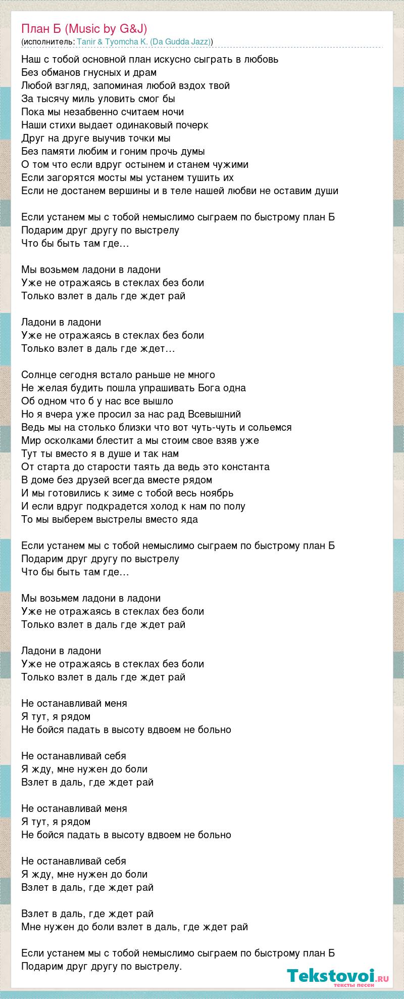Наш с тобой основной план искусно сыграть в любовь Без обманов гнусных и драм Любой взгляд, запоминая любой вздох твой За тысячу миль уловить смог бы Пока мы незабвенно считаем ночи Наши стихи выдает одинаковый почерк Друг на друге выучив точки мы Без памяти любим и гоним прочь думы О том что если вдруг остынем и станем чужими Если загорятся мосты мы устанем тушить их Если не достанем вершины и в теле нашей любви не оставим души Если устанем мы с тобой немыслимо сыграем по быстрому план Б Подарим друг другу по выстрелу Что бы быть там где… Мы возьмем ладони в ладони Уже не отражаясь в стеклах без боли Только взлет в даль где ждет рай Ладони в ладони Уже не отражаясь в стеклах без боли Только взлет в даль где ждет… Солнце сегодня встало раньше не много Не желая будить пошла упрашивать Бога одна Об одном что б у нас все вышло Но я вчера уже просил за нас рад Всевышний Ведь мы на столько близки что вот чуть-чуть и сольемся Мир осколками блестит а мы стоим свое взяв уже Тут ты вместо я в душе и так нам От старта до старости таять да ведь это константа В доме без друзей всегда вместе рядом И мы готовились к зиме с тобой весь ноябрь И если вдруг подкрадется холод к нам по полу То мы выберем выстрелы вместо яда Если устанем мы с тобой немыслимо сыграем по быстрому план Б Подарим друг другу по выстрелу Что бы быть там где… Мы возьмем ладони в ладони Уже не отражаясь в стеклах без боли Только взлет в даль где ждет рай Ладони в ладони Уже не отражаясь в стеклах без боли Только взлет в даль где ждет рай Не останавливай меня Я тут, я рядом Не бойся падать в высоту вдвоем не больно Не останавливай себя Я жду, мне нужен до боли Взлет в даль, где ждет рай Не останавливай меня Я тут, я рядом Не бойся падать в высоту вдвоем не больно Не останавливай себя Я жду, мне нужен до боли Взлет в даль, где ждет рай Взлет в даль, где ждет рай Мне нужен до боли взлет в даль, где ждет рай Если устанем мы с тобой немыслимо сыграем по быстрому план Б Подарим друг другу по выстрелу.