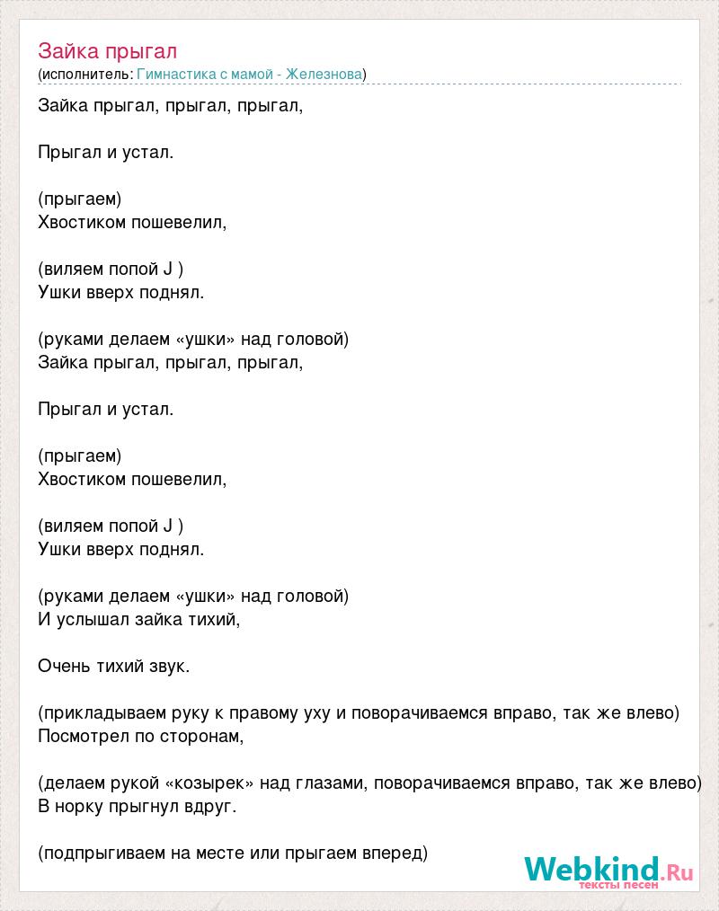 Зайка прыгал, прыгал, прыгал, Прыгал и устал. (прыгаем) Хвостиком пошевелил, (виляем попой J ) Ушки вверх поднял. (руками делаем «ушки» над головой) Зайка прыгал, прыгал, прыгал, Прыгал и устал. (прыгаем) Хвостиком пошевелил, (виляем попой J ) Ушки вверх поднял. (руками делаем «ушки» над головой) И услышал зайка тихий, Очень тихий звук. (прикладываем руку к правому уху и поворачиваемся вправо, так же влево) Посмотрел по сторонам, (делаем рукой «козырек» над глазами, поворачиваемся вправо, так же влево) В норку прыгнул вдруг. (подпрыгиваем на месте или прыгаем вперед)