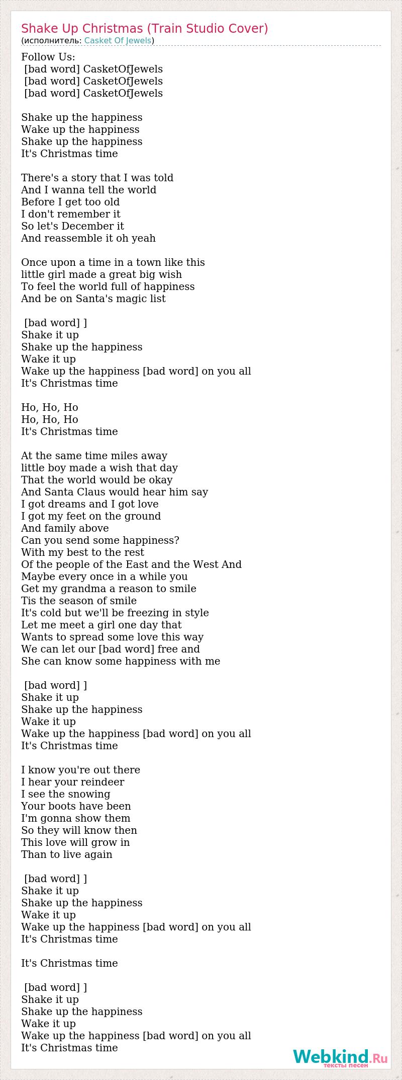 Follow Us: [bad word] CasketOfJewels [bad word] CasketOfJewels [bad word] CasketOfJewels Shake up the happiness Wake up the happiness Shake up the happiness It's Christmas time There's a story that I was told And I wanna tell the world Before I get too old I don't remember it So let's December it And reassemble it oh yeah Once upon a time in a town like this little girl made a great big wish To feel the world full of happiness And be on Santa's magic list [bad word] ] Shake it up Shake up the happiness Wake it up Wake up the happiness [bad word] on you all It's Christmas time Ho, Ho, Ho Ho, Ho, Ho It's Christmas time At the same time miles away little boy made a wish that day That the world would be okay And Santa Claus would hear him say I got dreams and I got love I got my feet on the ground And family above Can you send some happiness? With my best to the rest Of the people of the East and the West And Maybe every once in a while you Get my grandma a reason to smile Tis the season of smile It's cold but we'll be freezing in style Let me meet a girl one day that Wants to spread some love this way We can let our [bad word] free and She can know some happiness with me [bad word] ] Shake it up Shake up the happiness Wake it up Wake up the happiness [bad word] on you all It's Christmas time I know you're out there I hear your reindeer I see the snowing Your boots have been I'm gonna show them So they will know then This love will grow in Than to live again [bad word] ] Shake it up Shake up the happiness Wake it up Wake up the happiness [bad word] on you all It's Christmas time It's Christmas time [bad word] ] Shake it up Shake up the happiness Wake it up Wake up the happiness [bad word] on you all It's Christmas time