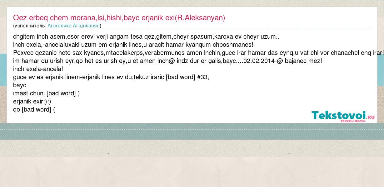 Главная→Исполнители→Анжелика Агаджанян→Qez erbeq chem morana,lsi,hishi,bayc erjanik exi(R.Aleksanyan)