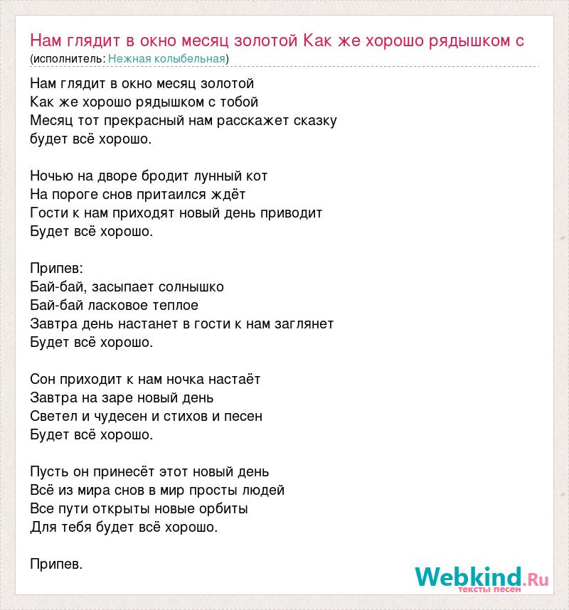 Нам глядит в окно месяц золотой Как же хорошо рядышком с тобой Месяц тот прекрасный нам расскажет сказку будет всё хорошо. Ночью на дворе бродит лунный кот На пороге снов притаился ждёт Гости к нам приходят новый день приводит Будет всё хорошо. Припев: Бай-бай, засыпает солнышко Бай-бай ласковое теплое Завтра день настанет в гости к нам заглянет Будет всё хорошо. Сон приходит к нам ночка настаёт Завтра на заре новый день Светел и чудесен и стихов и песен Будет всё хорошо. Пусть он принесёт этот новый день Всё из мира снов в мир просты людей Все пути открыты новые орбиты Для тебя будет всё хорошо. Припев.