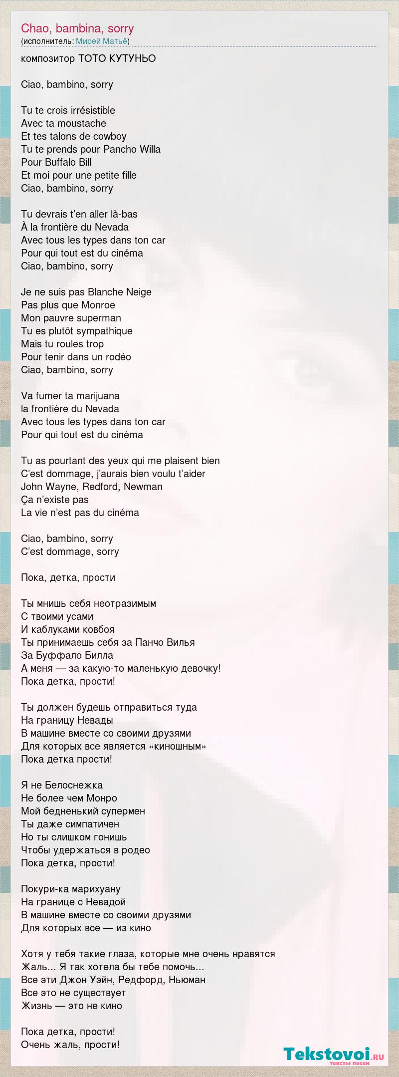 композитор ТОТО КУТУНЬО Ciao, bambino, sorry Tu te crois irrésistible Avec ta moustache Et tes talons de cowboy Tu te prends pour Pancho Willa Pour Buffalo Bill Et moi pour une petite fille Ciao, bambino, sorry Tu devrais t’en aller là-bas À la frontière du Nevada Avec tous les types dans ton car Pour qui tout est du cinéma Ciao, bambino, sorry Je ne suis pas Blanche Neige Pas plus que Monroe Mon pauvre superman Tu es plutôt sympathique Mais tu roules trop Pour tenir dans un rodéo Ciao, bambino, sorry Va fumer ta marijuana la frontière du Nevada Avec tous les types dans ton car Pour qui tout est du cinéma Tu as pourtant des yeux qui me plaisent bien C’est dommage, j’aurais bien voulu t’aider John Wayne, Redford, Newman Ça n’existe pas La vie n’est pas du cinéma Ciao, bambino, sorry C’est dommage, sorry Пока, детка, прости Ты мнишь себя неотразимым С твоими усами И каблуками ковбоя Ты принимаешь себя за Панчо Вилья За Буффало Билла А меня — за какую-то маленькую девочку! Пока детка, прости! Ты должен будешь отправиться туда На границу Невады В машине вместе со своими друзями Для которых все является «киношным» Пока детка прости! Я не Белоснежка Не более чем Монро Мой бедненький супермен Ты даже симпатичен Но ты слишком гонишь Чтобы удержаться в родео Пока детка, прости! Покури-ка марихуану На границе с Невадой В машине вместе со своими друзями Для которых все — из кино Хотя у тебя такие глаза, которые мне очень нравятся Жаль... Я так хотела бы тебе помочь... Все эти Джон Уэйн, Редфорд, Ньюман Все это не существует Жизнь — это не кино Пока детка, прости! Очень жаль, прости!