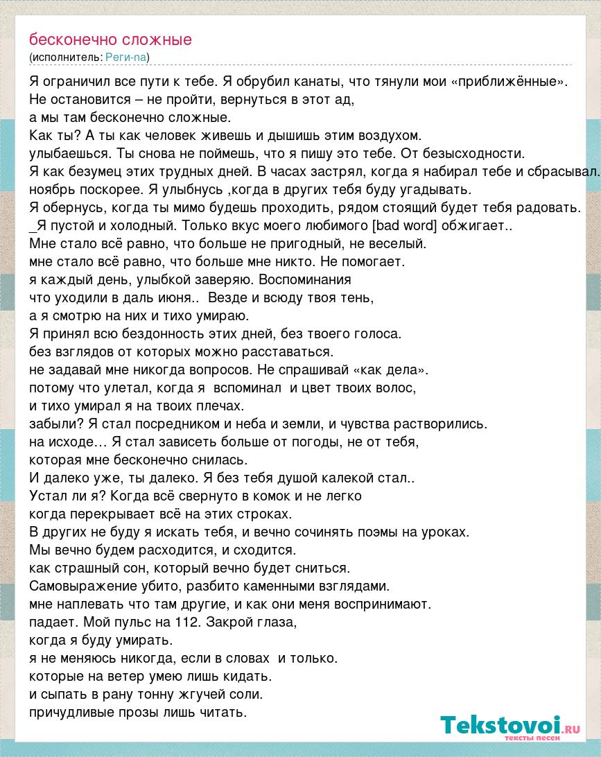 Я ограничил все пути к тебе. Я обрубил канаты, что тянули мои «приближённые». Не остановится – не пройти, вернуться в этот ад, а мы там бесконечно сложные. Как ты? А ты как человек живешь и дышишь этим воздухом. улыбаешься. Ты снова не поймешь, что я пишу это тебе. От безысходности. Я как безумец этих трудных дней. В часах застрял, когда я набирал тебе и сбрасывал. ноябрь поскорее. Я улыбнусь ,когда в других тебя буду угадывать. Я обернусь, когда ты мимо будешь проходить, рядом стоящий будет тебя радовать. _Я пустой и холодный. Только вкус моего любимого [bad word] обжигает.. Мне стало всё равно, что больше не пригодный, не веселый. мне стало всё равно, что больше мне никто. Не помогает. я каждый день, улыбкой заверяю. Воспоминания что уходили в даль июня.. Везде и всюду твоя тень, а я смотрю на них и тихо умираю. Я принял всю бездонность этих дней, без твоего голоса. без взглядов от которых можно расставаться. не задавай мне никогда вопросов. Не спрашивай «как дела». потому что улетал, когда я вспоминал и цвет твоих волос, и тихо умирал я на твоих плечах. забыли? Я стал посредником и неба и земли, и чувства растворились. на исходе… Я стал зависеть больше от погоды, не от тебя, которая мне бесконечно снилась. И далеко уже, ты далеко. Я без тебя душой калекой стал.. Устал ли я? Когда всё свернуто в комок и не легко когда перекрывает всё на этих строках. В других не буду я искать тебя, и вечно сочинять поэмы на уроках. Мы вечно будем расходится, и сходится. как страшный сон, который вечно будет сниться. Самовыражение убито, разбито каменными взглядами. мне наплевать что там другие, и как они меня воспринимают. падает. Мой пульс на 112. Закрой глаза, когда я буду умирать. я не меняюсь никогда, если в словах и только. которые на ветер умею лишь кидать. и сыпать в рану тонну жгучей соли. причудливые прозы лишь читать.