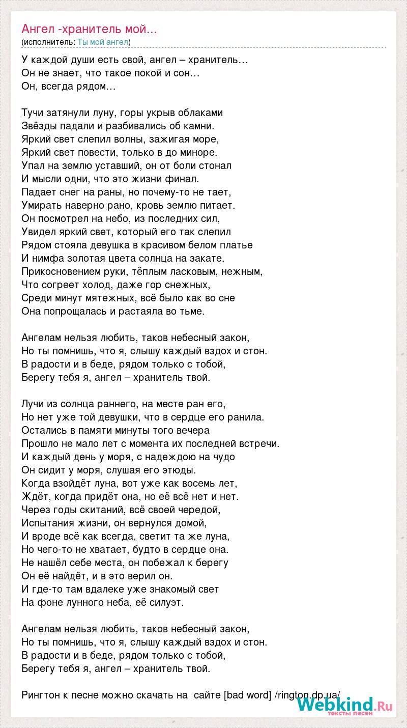 У каждой души есть свой, ангел – хранитель… Он не знает, что такое покой и сон… Он, всегда рядом… Тучи затянули луну, горы укрыв облаками Звёзды падали и разбивались об камни. Яркий свет слепил волны, зажигая море, Яркий свет повести, только в до миноре. Упал на землю уставший, он от боли стонал И мысли одни, что это жизни финал. Падает снег на раны, но почему-то не тает, Умирать наверно рано, кровь землю питает. Он посмотрел на небо, из последних сил, Увидел яркий свет, который его так слепил Рядом стояла девушка в красивом белом платье И нимфа золотая цвета солнца на закате. Прикосновением руки, тёплым ласковым, нежным, Что согреет холод, даже гор снежных, Среди минут мятежных, всё было как во сне Она попрощалась и растаяла во тьме. Ангелам нельзя любить, таков небесный закон, Но ты помнишь, что я, слышу каждый вздох и стон. В радости и в беде, рядом только с тобой, Берегу тебя я, ангел – хранитель твой. Лучи из солнца раннего, на месте ран его, Но нет уже той девушки, что в сердце его ранила. Остались в памяти минуты того вечера Прошло не мало лет с момента их последней встречи. И каждый день у моря, с надеждою на чудо Он сидит у моря, слушая его этюды. Когда взойдёт луна, вот уже как восемь лет, Ждёт, когда придёт она, но её всё нет и нет. Через годы скитаний, всё своей чередой, Испытания жизни, он вернулся домой, И вроде всё как всегда, светит та же луна, Но чего-то не хватает, будто в сердце она. Не нашёл себе места, он побежал к берегу Он её найдёт, и в это верил он. И где-то там вдалеке уже знакомый свет На фоне лунного неба, её силуэт. Ангелам нельзя любить, таков небесный закон, Но ты помнишь, что я, слышу каждый вздох и стон. В радости и в беде, рядом только с тобой, Берегу тебя я, ангел – хранитель твой. Рингтон к песне можно скачать на сайте [bad word] /rington.dp.ua/