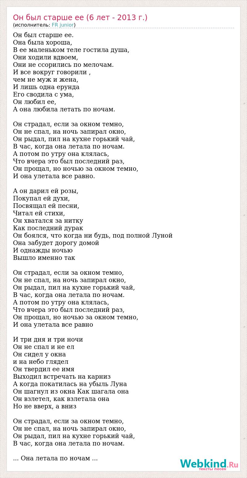 Он был старше ее. Она была хороша, В ее маленьком теле гостила душа, Они ходили вдвоем, Они не ссорились по мелочам. И все вокруг говорили , чем не муж и жена, И лишь одна ерунда Его сводила с ума, Он любил ее, А она любила летать по ночам. Он страдал, если за окном темно, Он не спал, на ночь запирал окно, Он рыдал, пил на кухне горький чай, В час, когда она летала по ночам. А потом по утру она клялась, Что вчера это был последний раз, Он прощал, но ночью за окном темно, И она улетала все равно. А он дарил ей розы, Покупал ей духи, Посвящал ей песни, Читал ей стихи, Он хватался за нитку Как последний дурак Он боялся, что когда ни будь, под полной Луной Она забудет дорогу домой И однажды ночью Вышло именно так Он страдал, если за окном темно, Он не спал, на ночь запирал окно, Он рыдал, пил на кухне горький чай, В час, когда она летала по ночам. А потом по утру она клялась, Что вчера это был последний раз, Он прощал, но ночью за окном темно, И она улетала все равно И три дня и три ночи Он не спал и не ел Он сидел у окна и на небо глядел Он твердил ее имя Выходил встречать на карниз А когда покатилась на убыль Луна Он шагнул из окна Как шагала она Он взлетел, как взлетала она Но не вверх, а вниз Он страдал, если за окном темно, Он не спал, на ночь запирал окно, Он рыдал, пил на кухне горький чай, В час, когда она летала по ночам. ... Она летала по ночам ...