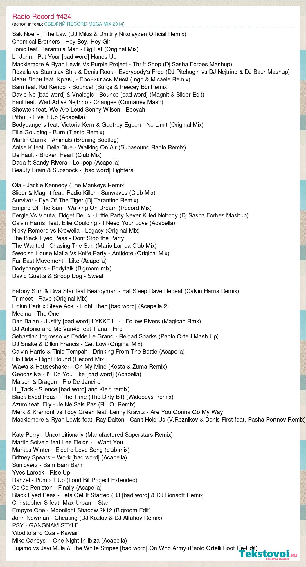 Sak Noel - I The Law (DJ Mikis & Dmitriy Nikolayzen Official Remix) Chemical Brothers - Hey Boy, Hey Girl Tonic feat. Tarantula Man - Big Fat (Original Mix) Lil John - Put Your [bad word] Hands Up Macklemore & Ryan Lewis Vs Purple Project - Thrift Shop (Dj Sasha Forbes Mashup) Rozalla vs Stanislav Shik & Denis Rook - Everybody's Free (DJ Pitchugin vs DJ Nejtrino & DJ Baur Mashup) Иван Дорн feat. Кравц - Прониклась Мной (Ingo & Micaele Remix) Bam feat. Kid Kenobi - Bounce! (Burgs & Reecey Boi Remix) David No [bad word] & Vnalogic - Bounce [bad word] (Magnit & Slider Edit) Faul feat. Wad Ad vs Nejtrino - Changes (Gumanev Mash) Showtek feat. We Are Loud Sonny Wilson - Booyah Pitbull - Live It Up (Acapella) Bodybangers feat. Victoria Kern & Godfrey Egbon - No Limit (Original Mix) Ellie Goulding - Burn (Tiesto Remix) Martin Garrix - Animals (Broning Bootleg) Anise K feat. Bella Blue - Walking On Air (Supasound Radio Remix) De Fault - Broken Heart (Club Mix) Dada ft Sandy Rivera - Lollipop (Acapella) Beauty Brain & Subshock - Drunk Fighters Ola - Jackie Kennedy (The Mankeys Remix) Slider & Magnit feat. Radio Killer - Sunwaves (Club Mix) Survivor - Eye Of The Tiger (Dj Tarantino Remix) Empire Of The Sun - Walking On Dream (Record Mix) Fergie Vs Viduta, Fidget,Delux - Little Party Never Killed Nobody (Dj Sasha Forbes Mashup) Calvin Harris feat. Ellie Goulding - I Need Your Love (Acapella) Nicky Romero vs Krewella - Legacy (Original Mix) The Black Eyed Peas - Dont Stop the Party The Wanted - Chasing The Sun (Mario Larrea Club Mix) Swedish House Mafia Vs Knife Party - Antidote (Original Mix) Far East Movement - Like (Acapella) Bodybangers - Bodytalk (Bigroom mix) David Guetta & Snoop Dog - Sweat Fatboy Slim & Riva Star feat Beardyman - Eat Sleep Rave Repeat (Calvin Harris Remix) Tr-meet - Rave (Original Mix) Linkin Park x Steve Aoki - Light Theh Never Comes (Acapella 2) Medina - The One Dan Balan - Justify [bad word] LYKKE LI - I Follow Rivers (Magican Rmx) DJ Antonio and Mc Van4o feat Tiana - Fire Sebastian Ingrosso vs Fedde Le Grand - Reload Sparks (Paolo Ortelli Mash Up) DJ Snake & Dillon Francis - Get Low (Original Mix) Calvin Harris & Tinie Tempah - Drinking From The Bottle (Acapella) Flo Rida - Right Round (Record Mix) Wawa & Houseshaker - On My Mind (Kosta & Zuma Remix) Geodasilva - I'll Do You Like Truck (Acapella) Maison & Dragen - Rio De Janeiro Hi_Tack - Silence (Dabruck and Klein remix) Black Eyed Peas – The Time (The Dirty Bit) (Wideboys Remix) Azuro feat. Elly - Je Ne Sais Pas (R.I.O. Remix) Merk & Kremont vs Toby Green feat. Lenny Kravitz - Are You Gonna Go My Way Macklemore & Ryan Lewis feat. Ray Dalton - Can't Hold Us (V.Reznikov & Denis First feat. Pasha Portnov Remix) Katy Perry - Unconditionally (Manufactured Superstars Remix) Martin Solveig feat Lee Fields - I Want You Markus Winter - Electro Love Song (club mix) Britney Spears – Work [bad word] (Acapella) Sunloverz - Bam Bam Bam Yves Larock - Rise Up Danzel - Pump It Up (Loud Bit Project Extended) Ce Ce Peniston - Finally (Acapella) Black Eyed Peas - Lets Get It Started (DJ Denis Rublev & DJ Borisoff Remix) Christopher S feat. Max Urban – Star Empyre One - Moonlight Shadow 2k12 (Bigroom Edit) John Newman - Cheating (DJ Kozlov & DJ Altuhov Remix) PSY - GANGNAM STYLE Vitodito and Oza - Kawaii Mike Candys - One Night In Ibiza (Acapella) Tujamo vs Javi Mula & The White Stripes - Come On Who Army (Paolo Ortelli Boot Re-Edit)