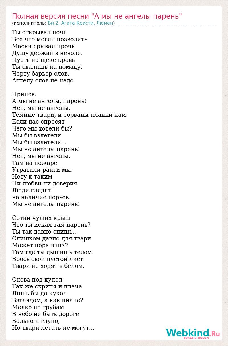 Ты открывал ночь Все что могли позволить Маски срывал прочь Душу держал в неволе. Пусть на щеке кровь Ты свалишь на помаду. Черту барьер слов. Ангелу слов не надо. Припев: А мы не ангелы, парень! Нет, мы не ангелы. Темные твари, и сорваны планки нам. Если нас спросят Чего мы хотели бы? Мы бы взлетели Мы бы взлетели... Мы не ангелы парень! Нет, мы не ангелы. Там на пожаре Утратили ранги мы. Нету к таким Ни любви ни доверия. Люди глядят на наличие перьев. Мы не ангелы парень! Сотни чужих крыш Что ты искал там парень? Ты так давно спишь.. Слишком давно для твари. Может пора вниз? Там где ты дышишь телом. Брось свой пустой лист. Твари не ходят в белом. Снова под купол Так же скрипя и плача Лишь бы до кукол Взглядом, а как иначе? Мелко по трубам В небо не быть дороге Больно и глупо, Но твари летать не могут...