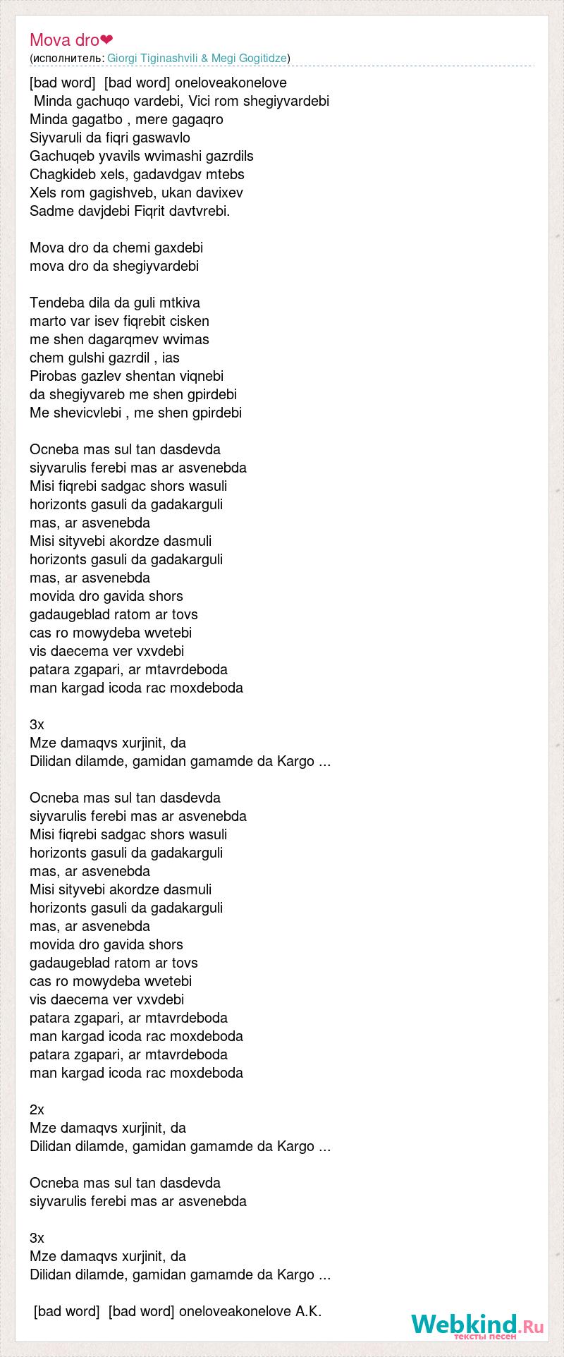 [bad word] [bad word] oneloveakonelove Minda gachuqo vardebi, Vici rom shegiyvardebi Minda gagatbo , mere gagaqro Siyvaruli da fiqri gaswavlo Gachuqeb yvavils wvimashi gazrdils Chagkideb xels, gadavdgav mtebs Xels rom gagishveb, ukan davixev Sadme davjdebi Fiqrit davtvrebi. Mova dro da chemi gaxdebi mova dro da shegiyvardebi Tendeba dila da guli mtkiva marto var isev fiqrebit cisken me shen dagarqmev wvimas chem gulshi gazrdil , ias Pirobas gazlev shentan viqnebi da shegiyvareb me shen gpirdebi Me shevicvlebi , me shen gpirdebi Ocneba mas sul tan dasdevda siyvarulis ferebi mas ar asvenebda Misi fiqrebi sadgac shors wasuli horizonts gasuli da gadakarguli mas, ar asvenebda Misi sityvebi akordze dasmuli horizonts gasuli da gadakarguli mas, ar asvenebda movida dro gavida shors gadaugeblad ratom ar tovs cas ro mowydeba wvetebi vis daecema ver vxvdebi patara zgapari, ar mtavrdeboda man kargad icoda rac moxdeboda 3x Mze damaqvs xurjinit, da Dilidan dilamde, gamidan gamamde da Kargo ... Ocneba mas sul tan dasdevda siyvarulis ferebi mas ar asvenebda Misi fiqrebi sadgac shors wasuli horizonts gasuli da gadakarguli mas, ar asvenebda Misi sityvebi akordze dasmuli horizonts gasuli da gadakarguli mas, ar asvenebda movida dro gavida shors gadaugeblad ratom ar tovs cas ro mowydeba wvetebi vis daecema ver vxvdebi patara zgapari, ar mtavrdeboda man kargad icoda rac moxdeboda patara zgapari, ar mtavrdeboda man kargad icoda rac moxdeboda 2x Mze damaqvs xurjinit, da Dilidan dilamde, gamidan gamamde da Kargo ... Ocneba mas sul tan dasdevda siyvarulis ferebi mas ar asvenebda 3x Mze damaqvs xurjinit, da Dilidan dilamde, gamidan gamamde da Kargo ... [bad word] [bad word] oneloveakonelove А.К.