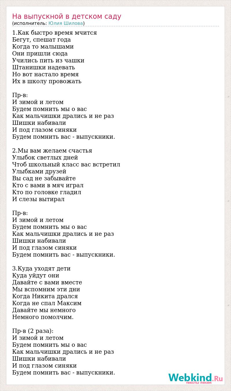 1.Как быстро время мчится Бегут, спешат года Когда то малышами Они пришли сюда Учились пить из чашки Штанишки надевать Но вот настало время Их в школу провожать Пр-в: И зимой и летом Будем помнить мы о вас Как мальчишки дрались и не раз Шишки набивали И под глазом синяки Будем помнить вас - выпускники. 2.Мы вам желаем счастья Улыбок светлых дней Чтоб школьный класс вас встретил Улыбками друзей Вы сад не забывайте Кто с вами в мяч играл Кто по головке гладил И слезы вытирал Пр-в: И зимой и летом Будем помнить мы о вас Как мальчишки дрались и не раз Шишки набивали И под глазом синяки Будем помнить вас - выпускники. 3.Куда уходят дети Куда уйдут они Давайте с вами вместе Мы вспомним эти дни Когда Никита дрался Когда не спал Максим Давайте мы немного Немного помолчим. Пр-в (2 раза): И зимой и летом Будем помнить мы о вас Как мальчишки дрались и не раз Шишки набивали И под глазом синяки Будем помнить вас - выпускники.
