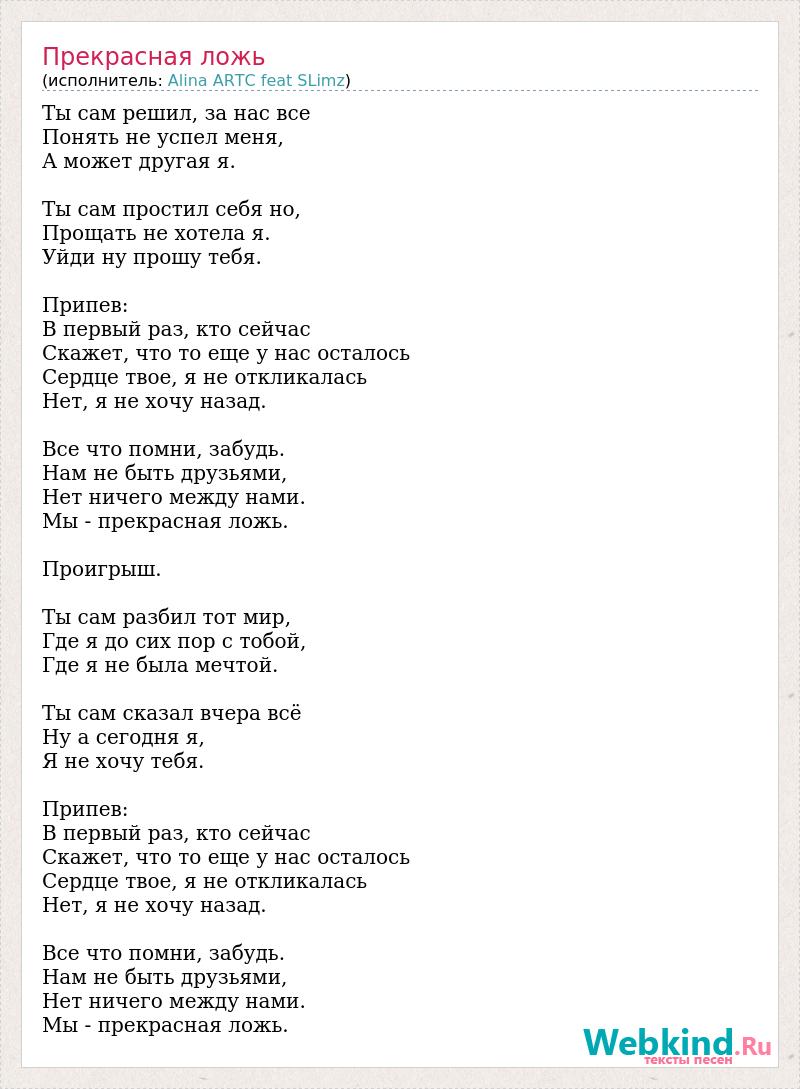 Ты сам решил, за нас все Понять не успел меня, А может другая я. Ты сам простил себя но, Прощать не хотела я. Уйди ну прошу тебя. Припев: В первый раз, кто сейчас Скажет, что то еще у нас осталось Сердце твое, я не откликалась Нет, я не хочу назад. Все что помни, забудь. Нам не быть друзьями, Нет ничего между нами. Мы - прекрасная ложь. Проигрыш. Ты сам разбил тот мир, Где я до сих пор с тобой, Где я не была мечтой. Ты сам сказал вчера всё Ну а сегодня я, Я не хочу тебя. Припев: В первый раз, кто сейчас Скажет, что то еще у нас осталось Сердце твое, я не откликалась Нет, я не хочу назад. Все что помни, забудь. Нам не быть друзьями, Нет ничего между нами. Мы - прекрасная ложь.