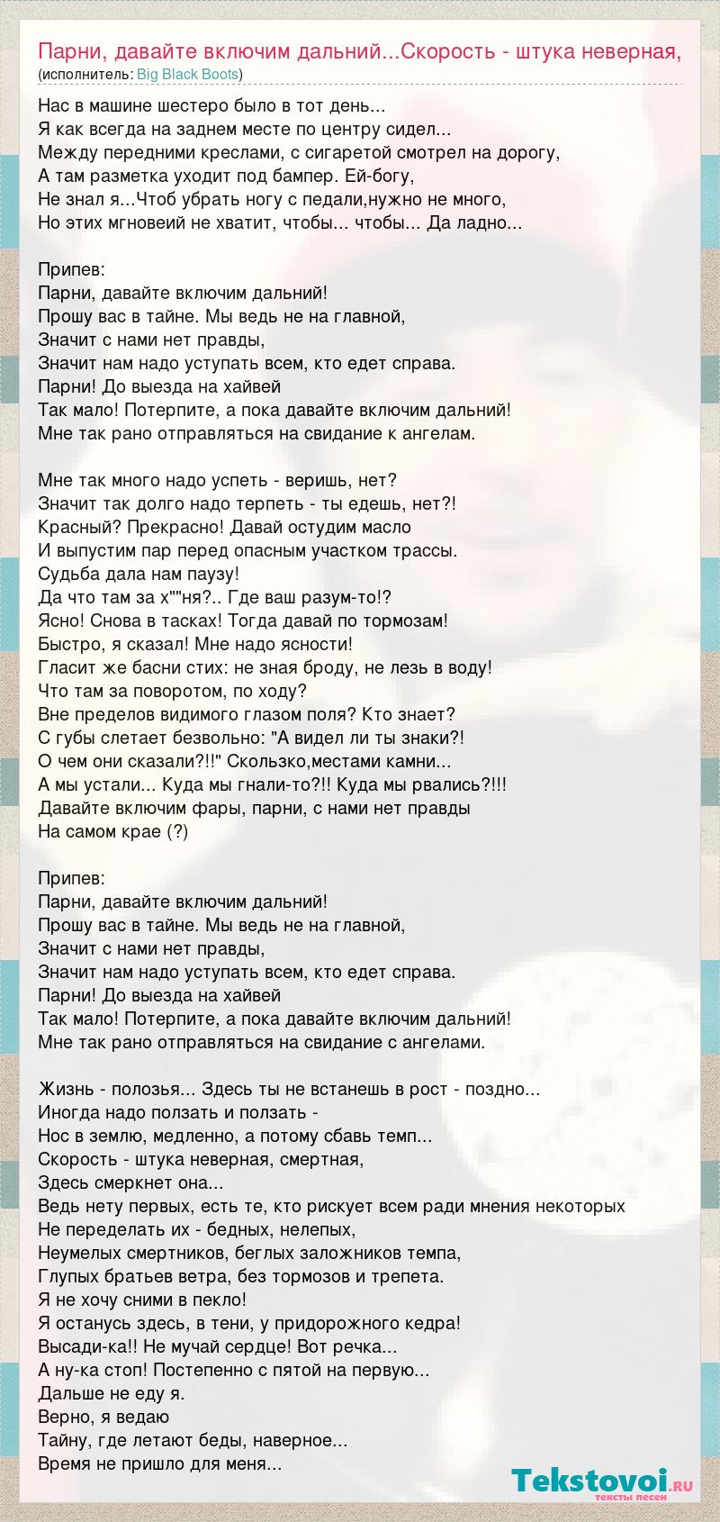 Нас в машине шестеро было в тот день... Я как всегда на заднем месте по центру сидел... Между передними креслами, с сигаретой смотрел на дорогу, А там разметка уходит под бампер. Ей-богу, Не знал я...Чтоб убрать ногу с педали,нужно не много, Но этих мгновеий не хватит, чтобы... чтобы... Да ладно... Припев: Парни, давайте включим дальний! Прошу вас в тайне. Мы ведь не на главной, Значит с нами нет правды, Значит нам надо уступать всем, кто едет справа. Парни! До выезда на хайвей Так мало! Потерпите, а пока давайте включим дальний! Мне так рано отправляться на свидание к ангелам. Мне так много надо успеть - веришь, нет? Значит так долго надо терпеть - ты едешь, нет?! Красный? Прекрасно! Давай остудим масло И выпустим пар перед опасным участком трассы. Судьба дала нам паузу! Да что там за х""ня?.. Где ваш разум-то!? Ясно! Снова в тасках! Тогда давай по тормозам! Быстро, я сказал! Мне надо ясности! Гласит же басни стих: не зная броду, не лезь в воду! Что там за поворотом, по ходу? Вне пределов видимого глазом поля? Кто знает? С губы слетает безвольно: "А видел ли ты знаки?! О чем они сказали?!!" Скользко,местами камни... А мы устали... Куда мы гнали-то?!! Куда мы рвались?!!! Давайте включим фары, парни, с нами нет правды На самом крае (?) Припев: Парни, давайте включим дальний! Прошу вас в тайне. Мы ведь не на главной, Значит с нами нет правды, Значит нам надо уступать всем, кто едет справа. Парни! До выезда на хайвей Так мало! Потерпите, а пока давайте включим дальний! Мне так рано отправляться на свидание с ангелами. Жизнь - полозья... Здесь ты не встанешь в рост - поздно... Иногда надо ползать и ползать - Нос в землю, медленно, а потому сбавь темп... Скорость - штука неверная, смертная, Здесь смеркнет она... Ведь нету первых, есть те, кто рискует всем ради мнения некоторых Не переделать их - бедных, нелепых, Неумелых смертников, беглых заложников темпа, Глупых братьев ветра, без тормозов и трепета. Я не хочу сними в пекло! Я останусь здесь, в тени, у придорожного кедра! Высади-ка!! Не мучай сердце! Вот речка... А ну-ка стоп! Постепенно с пятой на первую... Дальше не еду я. Верно, я ведаю Тайну, где летают беды, наверное... Время не пришло для меня...