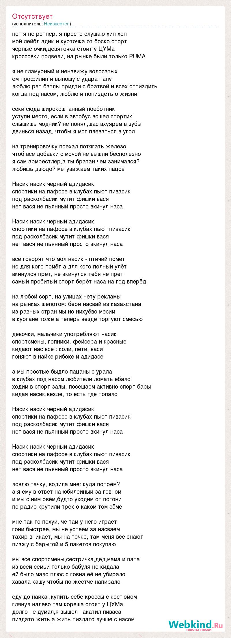 нет я не рэппер, я просто слушаю хип хоп мой лейбл адик и курточка от боско спорт черные очки,девяточка стоит у ЦУМа кроссовки подвели, на рынке были только PUMA я не гламурный и ненавижу волосатых ем профилин и выношу с удара папу люблю рэп батлы,придти с братвой и всех отпиздить когда под насом, люблю и попиздеть о жизни секи сюда широкоштанный поеботник уступи место, если в автобус вошел спортик слышишь модник? не понял,щас вхуярем в зубы двинься назад, чтобы я мог плеваться в угол на тренировочку поехал потягать железо чтоб все добавки с мочой не вышли бесполезно я сам армрестлер,а ты братан чем занимался? любишь дзюдо? мы уважаем таких пацов Насик насик черный адидасик спортики на пафосе в клубах пьют пивасик под расколбасик мутит фишки вася нет вася не пьянный просто вкинул наса Насик насик черный адидасик спортики на пафосе в клубах пьют пивасик под расколбасик мутит фишки вася нет вася не пьянный просто вкинул наса все говорят что мол насик - птичий помёт но для кого помёт а для кого полный улёт вкинулся прёт, не вкинулся тебя не прёт самый пробитый спорт берёт наса на год вперёд на любой сорт, на улицах нету рекламы на рынках шепотом: бери насвай из казахстана из разных стран мы но нихуёво месим в кургане тоже а теперь везде торгуют смесью девочки, мальчики употребляют насик спортсмены, гопники, фейсера и красные кидают нас все : коли, пети, васи гоняют в найке рибоке и адидасе а мы простые быдло пацаны с урала в клубах под насом любители ломать ебало ходим в спорт залы, посещаем активно спорт бары кидая насик,везде, то есть где попало Насик насик черный адидасик спортики на пафосе в клубах пьют пивасик под расколбасик мутит фишки вася нет вася не пьянный просто вкинул наса Насик насик черный адидасик спортики на пафосе в клубах пьют пивасик под расколбасик мутит фишки вася нет вася не пьянный просто вкинул наса ловлю тачку, водила мне: куда попрём? а я ему в ответ на юбилейный за говном и мы с ним рвём,будто уходим от погони по радио крутили трек о каком том сёме мне так то похуй, че там у него играет гони быстрее, мы не успеем за насваем тахир вникает, мы на точке, там меня все знают пизжу с барыгой и 5 пакетов покупаю мы все спортсмены,сестричка,дед,мама и папа из всей семьи только бабуля не кидала ей было мало плюс с говна её не убирало хавала кашу чтобы по жестче напирало еду до найка ,купить себе кроссы с костюмом глянул налево там кореша стоят у ЦУМа долго не думал,я вышел накатил пиваса пиздато жить,а жить пиздато лучше с насом