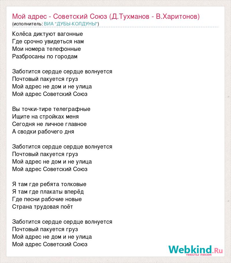 Колёса диктуют вагонные Где срочно увидеться нам Мои номера телефонные Разбросаны по городам Заботится сердце сердце волнуется Почтовый пакуется груз Мой адрес не дом и не улица Мой адрес Советский Союз Вы точки-тире телеграфные Ищите на стройках меня Сегодня не личное главное А сводки рабочего дня Заботится сердце сердце волнуется Почтовый пакуется груз Мой адрес не дом и не улица Мой адрес Советский Союз Я там где ребята толковые Я там где плакаты вперёд Где песни рабочие новые Страна трудовая поёт Заботится сердце сердце волнуется Почтовый пакуется груз Мой адрес не дом и не улица Мой адрес Советский Союз