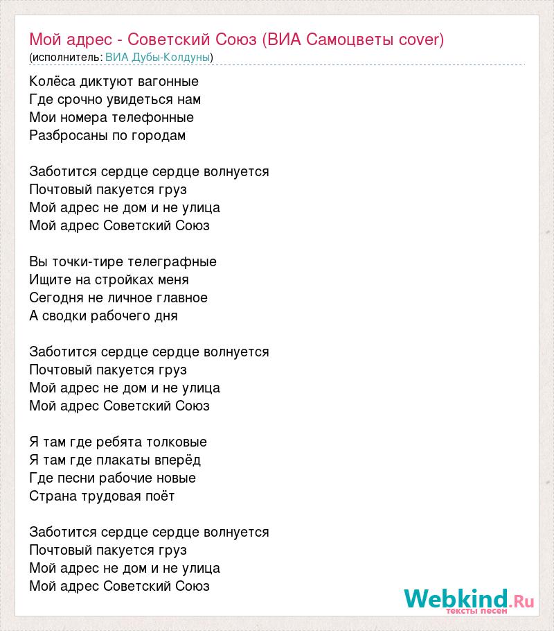 Колёса диктуют вагонные Где срочно увидеться нам Мои номера телефонные Разбросаны по городам Заботится сердце сердце волнуется Почтовый пакуется груз Мой адрес не дом и не улица Мой адрес Советский Союз Вы точки-тире телеграфные Ищите на стройках меня Сегодня не личное главное А сводки рабочего дня Заботится сердце сердце волнуется Почтовый пакуется груз Мой адрес не дом и не улица Мой адрес Советский Союз Я там где ребята толковые Я там где плакаты вперёд Где песни рабочие новые Страна трудовая поёт Заботится сердце сердце волнуется Почтовый пакуется груз Мой адрес не дом и не улица Мой адрес Советский Союз