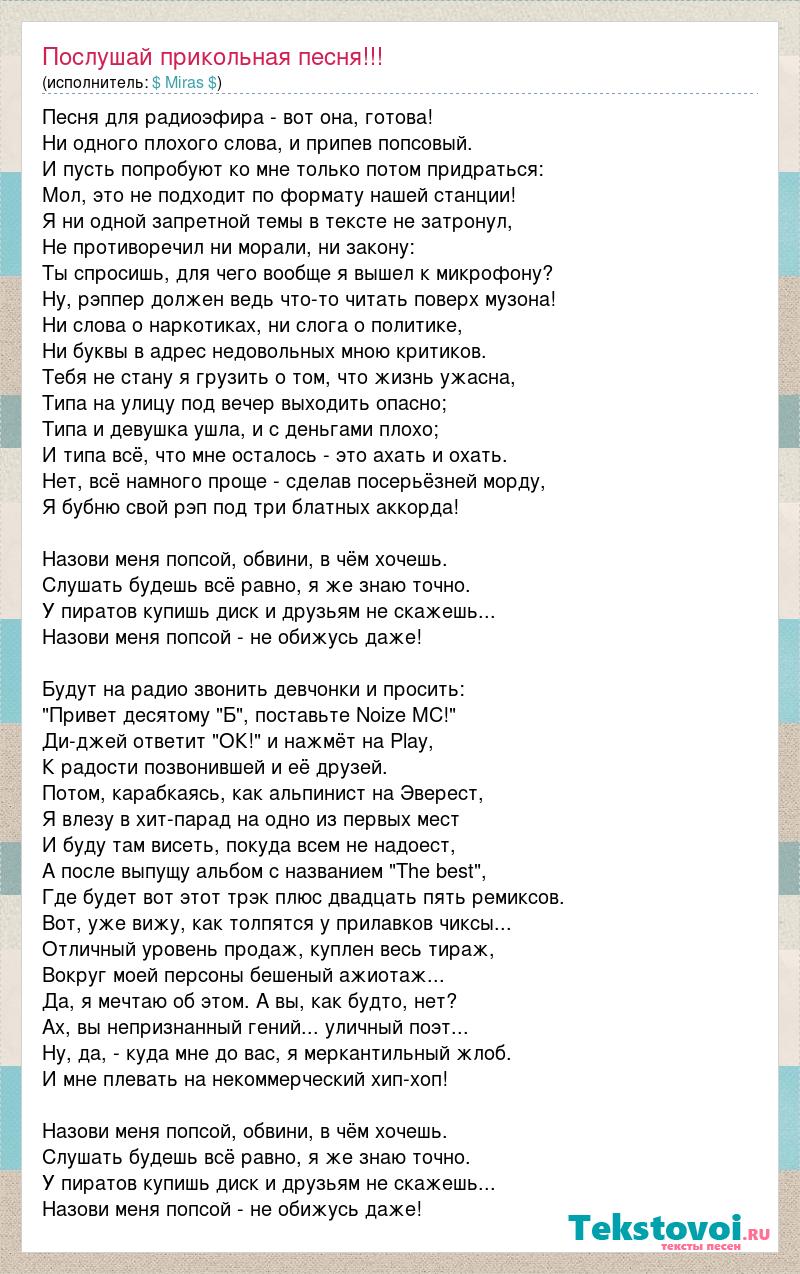 Песня для радиоэфира - вот она, готова! Ни одного плохого слова, и припев попсовый. И пусть попробуют ко мне только потом придраться: Мол, это не подходит по формату нашей станции! Я ни одной запретной темы в тексте не затронул, Не противоречил ни морали, ни закону: Ты спросишь, для чего вообще я вышел к микрофону? Ну, рэппер должен ведь что-то читать поверх музона! Ни слова о наркотиках, ни слога о политике, Ни буквы в адрес недовольных мною критиков. Тебя не стану я грузить о том, что жизнь ужасна, Типа на улицу под вечер выходить опасно; Типа и девушка ушла, и с деньгами плохо; И типа всё, что мне осталось - это ахать и охать. Нет, всё намного проще - сделав посерьёзней морду, Я бубню свой рэп под три блатных аккорда! Назови меня попсой, обвини, в чём хочешь. Слушать будешь всё равно, я же знаю точно. У пиратов купишь диск и друзьям не скажешь... Назови меня попсой - не обижусь даже! Будут на радио звонить девчонки и просить: "Привет десятому "Б", поставьте Noize MC!" Ди-джей ответит "ОК!" и нажмёт на Play, К радости позвонившей и её друзей. Потом, карабкаясь, как альпинист на Эверест, Я влезу в хит-парад на одно из первых мест И буду там висеть, покуда всем не надоест, А после выпущу альбом с названием "The best", Где будет вот этот трэк плюс двадцать пять ремиксов. Вот, уже вижу, как толпятся у прилавков чиксы... Отличный уровень продаж, куплен весь тираж, Вокруг моей персоны бешеный ажиотаж... Да, я мечтаю об этом. А вы, как будто, нет? Ах, вы непризнанный гений... уличный поэт... Ну, да, - куда мне до вас, я меркантильный жлоб. И мне плевать на некоммерческий хип-хоп! Назови меня попсой, обвини, в чём хочешь. Слушать будешь всё равно, я же знаю точно. У пиратов купишь диск и друзьям не скажешь... Назови меня попсой - не обижусь даже!