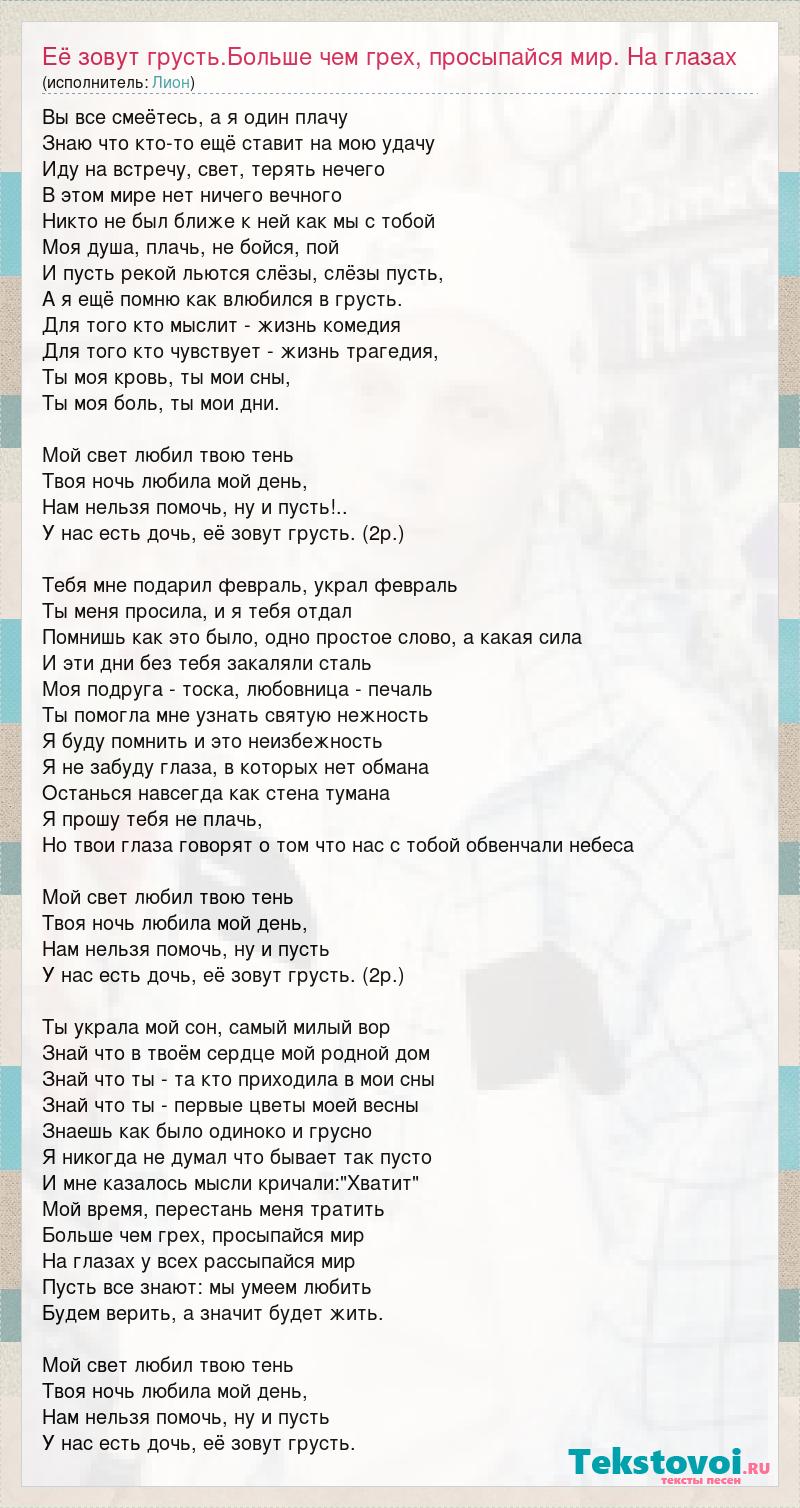 Вы все смеётесь, а я один плачу Знаю что кто-то ещё ставит на мою удачу Иду на встречу, свет, терять нечего В этом мире нет ничего вечного Никто не был ближе к ней как мы с тобой Моя душа, плачь, не бойся, пой И пусть рекой льются слёзы, слёзы пусть, А я ещё помню как влюбился в грусть. Для того кто мыслит - жизнь комедия Для того кто чувствует - жизнь трагедия, Ты моя кровь, ты мои сны, Ты моя боль, ты мои дни. Мой свет любил твою тень Твоя ночь любила мой день, Нам нельзя помочь, ну и пусть!.. У нас есть дочь, её зовут грусть. (2р.) Тебя мне подарил февраль, украл февраль Ты меня просила, и я тебя отдал Помнишь как это было, одно простое слово, а какая сила И эти дни без тебя закаляли сталь Моя подруга - тоска, любовница - печаль Ты помогла мне узнать святую нежность Я буду помнить и это неизбежность Я не забуду глаза, в которых нет обмана Останься навсегда как стена тумана Я прошу тебя не плачь, Но твои глаза говорят о том что нас с тобой обвенчали небеса Мой свет любил твою тень Твоя ночь любила мой день, Нам нельзя помочь, ну и пусть У нас есть дочь, её зовут грусть. (2р.) Ты украла мой сон, самый милый вор Знай что в твоём сердце мой родной дом Знай что ты - та кто приходила в мои сны Знай что ты - первые цветы моей весны Знаешь как было одиноко и грусно Я никогда не думал что бывает так пусто И мне казалось мысли кричали:"Хватит" Мой время, перестань меня тратить Больше чем грех, просыпайся мир На глазах у всех рассыпайся мир Пусть все знают: мы умеем любить Будем верить, а значит будет жить. Мой свет любил твою тень Твоя ночь любила мой день, Нам нельзя помочь, ну и пусть У нас есть дочь, её зовут грусть.