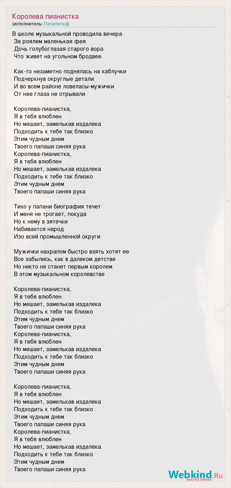 В школе музыкальной проводила вечера За роялем маленькая фея Дочь голубоглазая старого вора Что живет на угольном бродвее Как-то незаметно поднялась на каблучки Подчеркнув округлые детали И во всем районе ловеласы-мужички От нее глаза не отрывали Королева-пианистка, Я в тебя влюблен Но мешает, замелькав издалека Подходить к тебе так близко Этим чудным днем Твоего папаши синяя рука Королева-пианистка, Я в тебя влюблен Но мешает, замелькав издалека Подходить к тебе так близко Этим чудным днем Твоего папаши синяя рука Тихо у папани биография течет И меня не трогает, покуда Но к нему в зятечки Набивается народ Изо всей промышленной округи Мужички нахрапом быстро взять хотят ее Все забылись, как в далеком детстве Но никто не станет первым королем В этом музыкальном королевстве Королева-пианистка, Я в тебя влюблен Но мешает, замелькав издалека Подходить к тебе так близко Этим чудным днем Твоего папаши синяя рука Королева-пианистка, Я в тебя влюблен Но мешает, замелькав издалека Подходить к тебе так близко Этим чудным днем Твоего папаши синяя рука Королева-пианистка, Я в тебя влюблен Но мешает, замелькав издалека Подходить к тебе так близко Этим чудным днем Твоего папаши синяя рука Королева-пианистка, Я в тебя влюблен Но мешает, замелькав издалека Подходить к тебе так близко Этим чудным днем Твоего папаши синяя рука