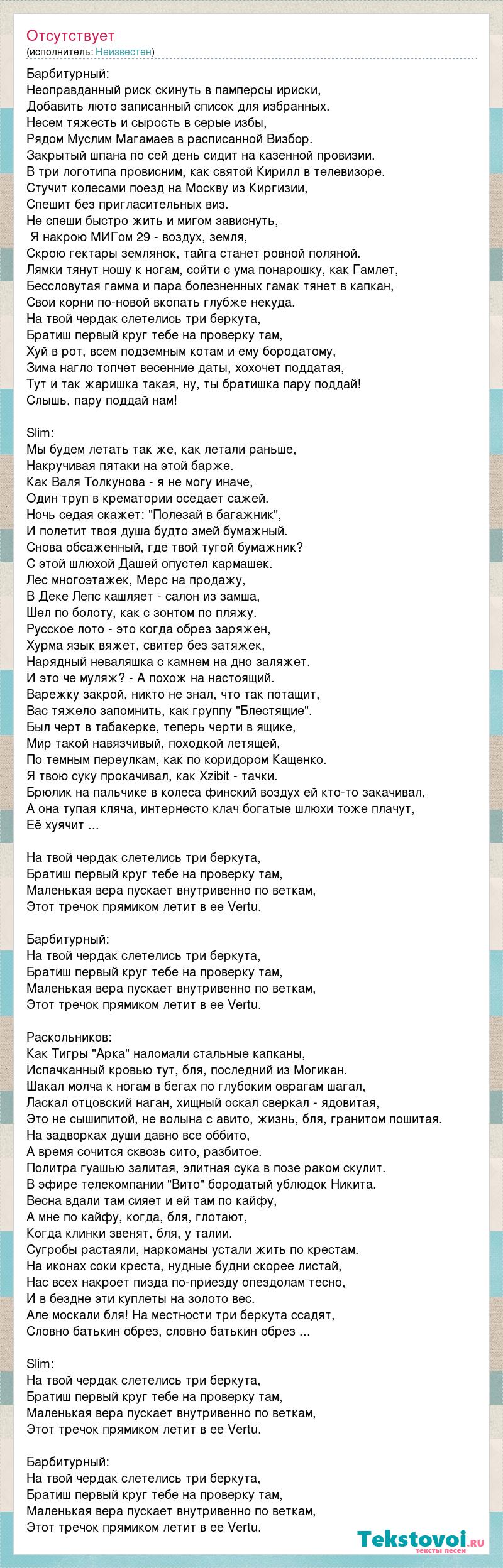 Барбитурный: Неоправданный риск скинуть в памперсы ириски, Добавить люто записанный список для избранных. Несем тяжесть и сырость в серые избы, Рядом Муслим Магамаев в расписанной Визбор. Закрытый шпана по сей день сидит на казенной провизии. В три логотипа провисним, как святой Кирилл в телевизоре. Стучит колесами поезд на Москву из Киргизии, Спешит без пригласительных виз. Не спеши быстро жить и мигом зависнуть, Я накрою МИГом 29 - воздух, земля, Скрою гектары землянок, тайга станет ровной поляной. Лямки тянут ношу к ногам, сойти с ума понарошку, как Гамлет, Бессловутая гамма и пара болезненных гамак тянет в капкан, Свои корни по-новой вкопать глубже некуда. На твой чердак слетелись три беркута, Братиш первый круг тебе на проверку там, Хуй в рот, всем подземным котам и ему бородатому, Зима нагло топчет весенние даты, хохочет поддатая, Тут и так жаришка такая, ну, ты братишка пару поддай! Слышь, пару поддай нам! Slim: Мы будем летать так же, как летали раньше, Накручивая пятаки на этой барже. Как Валя Толкунова - я не могу иначе, Один труп в крематории оседает сажей. Ночь седая скажет: "Полезай в багажник", И полетит твоя душа будто змей бумажный. Снова обсаженный, где твой тугой бумажник? С этой шлюхой Дашей опустел кармашек. Лес многоэтажек, Мерс на продажу, В Деке Лепс кашляет - салон из замша, Шел по болоту, как с зонтом по пляжу. Русское лото - это когда обрез заряжен, Хурма язык вяжет, свитер без затяжек, Нарядный неваляшка с камнем на дно заляжет. И это че муляж? - А похож на настоящий. Варежку закрой, никто не знал, что так потащит, Вас тяжело запомнить, как группу "Блестящие". Был черт в табакерке, теперь черти в ящике, Мир такой навязчивый, походкой летящей, По темным переулкам, как по коридором Кащенко. Я твою суку прокачивал, как Xzibit - тачки. Брюлик на пальчике в колеса финский воздух ей кто-то закачивал, А она тупая кляча, интернесто клач богатые шлюхи тоже плачут, Её хуячит ... На твой чердак слетелись три беркута, Братиш первый круг тебе на проверку там, Маленькая вера пускает внутривенно по веткам, Этот тречок прямиком летит в ее Vertu. Барбитурный: На твой чердак слетелись три беркута, Братиш первый круг тебе на проверку там, Маленькая вера пускает внутривенно по веткам, Этот тречок прямиком летит в ее Vertu. Раскольников: Как Тигры "Арка" наломали стальные капканы, Испачканный кровью тут, бля, последний из Могикан. Шакал молча к ногам в бегах по глубоким оврагам шагал, Ласкал отцовский наган, хищный оскал сверкал - ядовитая, Это не сышипитой, не волына с авито, жизнь, бля, гранитом пошитая. На задворках души давно все оббито, А время сочится сквозь сито, разбитое. Политра гуашью залитая, элитная сука в позе раком скулит. В эфире телекомпании "Вито" бородатый ублюдок Никита. Весна вдали там сияет и ей там по кайфу, А мне по кайфу, когда, бля, глотают, Когда клинки звенят, бля, у талии. Сугробы растаяли, наркоманы устали жить по крестам. На иконах соки креста, нудные будни скорее листай, Нас всех накроет пизда по-приезду опездолам тесно, И в бездне эти куплеты на золото вес. Але москали бля! На местности три беркута ссадят, Словно батькин обрез, словно батькин обрез ... Slim: На твой чердак слетелись три беркута, Братиш первый круг тебе на проверку там, Маленькая вера пускает внутривенно по веткам, Этот тречок прямиком летит в ее Vertu. Барбитурный: На твой чердак слетелись т