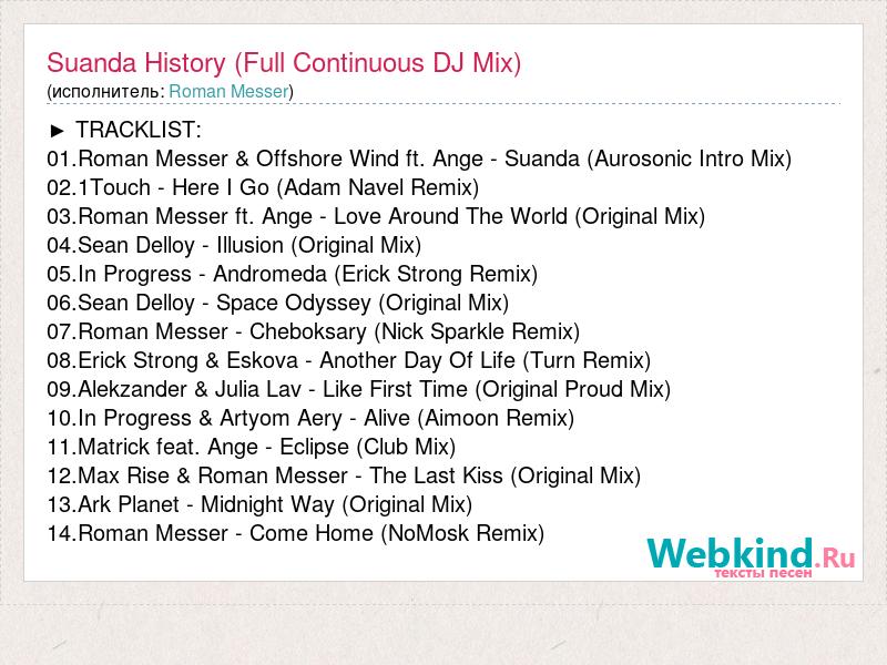 ► TRACKLIST: 01.Roman Messer & Offshore Wind ft. Ange - Suanda (Aurosonic Intro Mix) 02.1Touch - Here I Go (Adam Navel Remix) 03.Roman Messer ft. Ange - Love Around The World (Original Mix) 04.Sean Delloy - Illusion (Original Mix) 05.In Progress - Andromeda (Erick Strong Remix) 06.Sean Delloy - Space Odyssey (Original Mix) 07.Roman Messer - Cheboksary (Nick Sparkle Remix) 08.Erick Strong & Eskova - Another Day Of Life (Turn Remix) 09.Alekzander & Julia Lav - Like First Time (Original Proud Mix) 10.In Progress & Artyom Aery - Alive (Aimoon Remix) 11.Matrick feat. Ange - Eclipse (Club Mix) 12.Max Rise & Roman Messer - The Last Kiss (Original Mix) 13.Ark Planet - Midnight Way (Original Mix) 14.Roman Messer - Come Home (NoMosk Remix)
