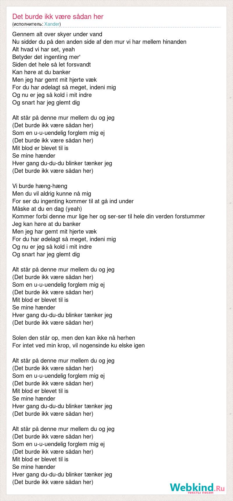 Gennem alt over skyer under vand Nu sidder du på den anden side af den mur vi har mellem hinanden Alt hvad vi har set, yeah Betyder det ingenting mer' Siden det hele så let forsvandt Kan høre at du banker Men jeg har gemt mit hjerte væk For du har ødelagt så meget, indeni mig Og nu er jeg så kold i mit indre Og snart har jeg glemt dig Alt står på denne mur mellem du og jeg (Det burde ikk være sådan her) Som en u-u-uendelig forglem mig ej (Det burde ikk være sådan her) Mit blod er blevet til is Se mine hænder Hver gang du-du-du blinker tænker jeg (Det burde ikk være sådan her) Vi burde hæng-hæng Men du vil aldrig kunne nå mig For ser du ingenting kommer til at gå ind under Måske at du en dag (yeah) Kommer forbi denne mur lige her og ser-ser til hele din verden forstummer Jeg kan høre at du banker Men jeg har gemt mit hjerte væk For du har ødelagt så meget, indeni mig Og nu er jeg så kold i mit indre Og snart har jeg glemt dig Alt står på denne mur mellem du og jeg (Det burde ikk være sådan her) Som en u-u-uendelig forglem mig ej (Det burde ikk være sådan her) Mit blod er blevet til is Se mine hænder Hver gang du-du-du blinker tænker jeg (Det burde ikk være sådan her) Solen den står op, men den kan ikke nå herhen For intet ved min krop, vil nogensinde ku elske igen Alt står på denne mur mellem du og jeg (Det burde ikk være sådan her) Som en u-u-uendelig forglem mig ej (Det burde ikk være sådan her) Mit blod er blevet til is Se mine hænder Hver gang du-du-du blinker tænker jeg (Det burde ikk være sådan her) Alt står på denne mur mellem du og jeg (Det burde ikk være sådan her) Som en u-u-uendelig forglem mig ej (Det burde ikk være sådan her) Mit blod er blevet til is Se mine hænder Hver gang du-du-du blinker tænker jeg (Det burde ikk være sådan her)