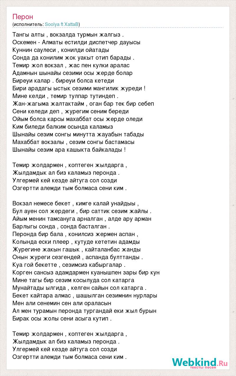 Тангы алты , вокзалда турмын жалгыз . Оскемен - Алматы естилди диспетчер дауысы Куннин саулеси , конилди ойатады Сонда да конилим жок уакыт отип барады . Темир жол вокзал , жас пен кулки аралас Адамнын шынайы сезими осы жерде болар Биреуи калар . биреуи болса кетеди Бири арадагы ыстык сезими мангилик журеди ! Мине келди , темир тулпар тутиндеп . Жан-жагыма жалтактайм , оган бар тек бир себеп Сени келеди деп , журегим сеним береди Ойым болса карсы махаббат осы жерде оледи Ким биледи балким осында каламыз Шынайы сезим сонгы минутта жауабын табады Махаббат вокзалы , сезим сонгы бастамасы Шынайы сезим ара кашыкта байкалады ! Темир жолдармен , коптеген жылдарга , Жылдамдык ал биз каламыз перонда . Улгермей кей кезде айтуга сол созди Озгертти алемди тым болмаса сени ким . Вокзал немесе бекет , кимге калай унайдыы , Бул ауен сол жердеги , бир саттик сезим жайлы . Айым менин тамсануга арналган , алде ару арман Барлыгы сонда , сонда басталган . Перонда бир бала , конилсиз жермен аспан , Колында ески плеер , кутуде кететин адамды Журегине жакын гашык , кайталанбас жанды Онын журеги сезгендей , аспанда булттанды . Куа гой бекетте , сезимсиз кабыргалар . Корген сансыз адамдармен куанышпен зары бир кун Мине тагы бир сезим косылуда сол катарга Мунайтады ылгида , келген сайын сол катарга . Бекет кайтара алмас , шашылган сезимнин нурлары Мен али сенемин сен али ораласын Ал мен турамын перонда тургандай еки жыл бурын Бирак осы жолы сени асыга кутип . Темир жолдармен , коптеген жылдарга , Жылдамдык ал биз каламыз перонда . Улгермей кей кезде айтуга сол созди Озгертти алемди тым болмаса сени ким .