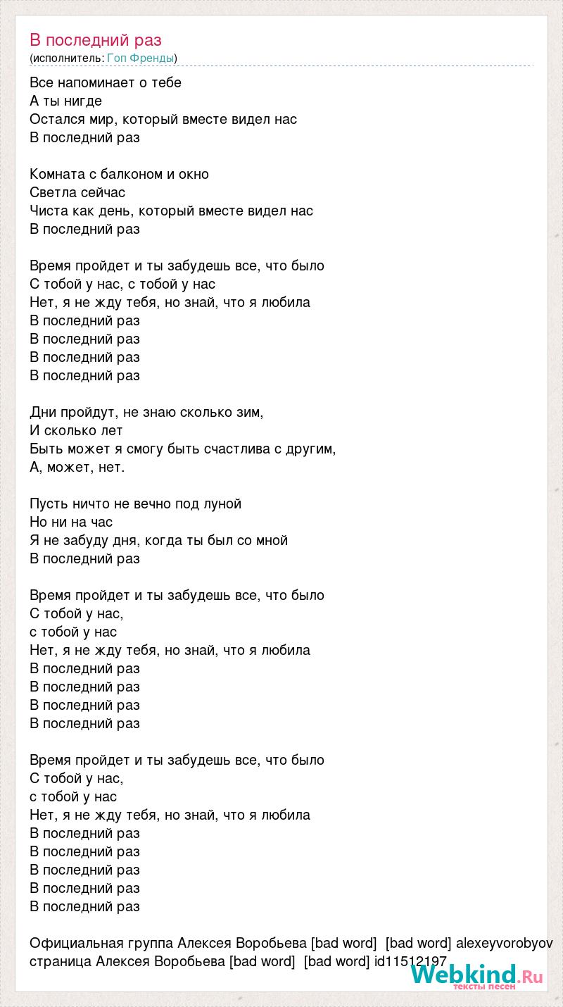 Все напоминает о тебе А ты нигде Остался мир, который вместе видел нас В последний раз Комната с балконом и окно Светла сейчас Чиста как день, который вместе видел нас В последний раз Время пройдет и ты забудешь все, что было С тобой у нас, с тобой у нас Нет, я не жду тебя, но знай, что я любила В последний раз В последний раз В последний раз В последний раз Дни пройдут, не знаю сколько зим, И сколько лет Быть может я смогу быть счастлива с другим, А, может, нет. Пусть ничто не вечно под луной Но ни на час Я не забуду дня, когда ты был со мной В последний раз Время пройдет и ты забудешь все, что было С тобой у нас, с тобой у нас Нет, я не жду тебя, но знай, что я любила В последний раз В последний раз В последний раз В последний раз Время пройдет и ты забудешь все, что было С тобой у нас, с тобой у нас Нет, я не жду тебя, но знай, что я любила В последний раз В последний раз В последний раз В последний раз В последний раз Официальная группа Алексея Воробьева [bad word] [bad word] alexeyvorobyov страница Алексея Воробьева [bad word] [bad word] id11512197