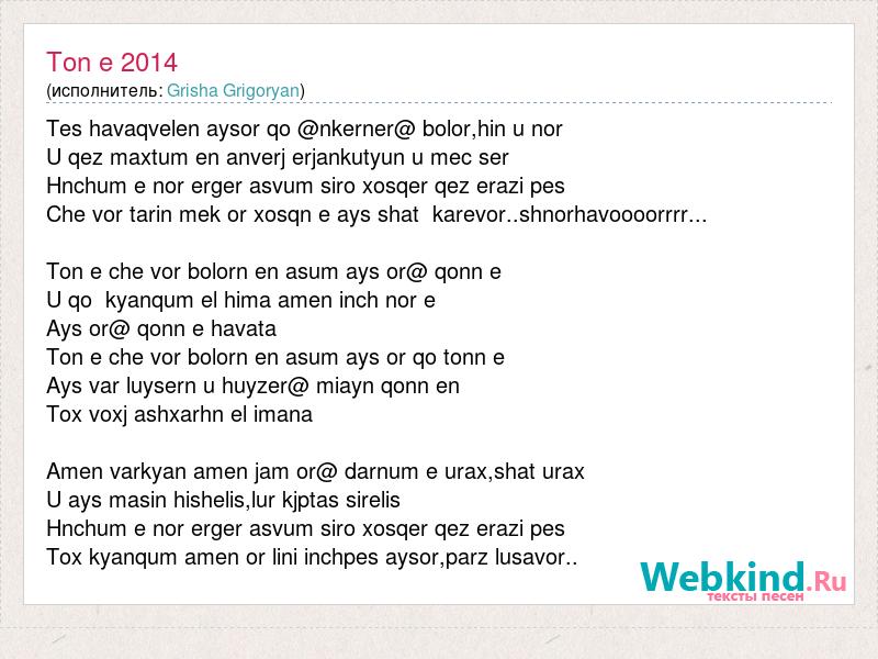 Tes havaqvelen aysor qo @nkerner@ bolor,hin u nor U qez maxtum en anverj erjankutyun u mec ser Hnchum e nor erger asvum siro xosqer qez erazi pes Che vor tarin mek or xosqn e ays shat karevor..shnorhavoooorrrr... Ton e che vor bolorn en asum ays or@ qonn e U qo kyanqum el hima amen inch nor e Ays or@ qonn e havata Ton e che vor bolorn en asum ays or qo tonn e Ays var luysern u huyzer@ miayn qonn en Tox voxj ashxarhn el imana Amen varkyan amen jam or@ darnum e urax,shat urax U ays masin hishelis,lur kjptas sirelis Hnchum e nor erger asvum siro xosqer qez erazi pes Tox kyanqum amen or lini inchpes aysor,parz lusavor..