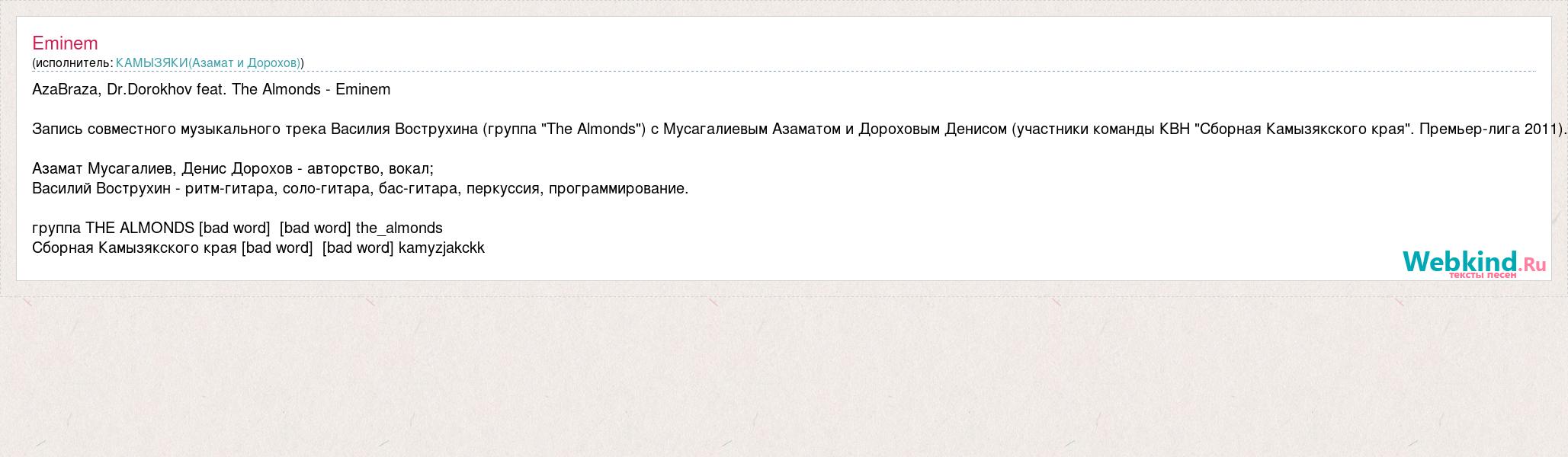 AzaBraza, Dr.Dorokhov feat. The Almonds - Eminem Запись совместного музыкального трека Василия Вострухина (группа "The Almonds") с Мусагалиевым Азаматом и Дороховым Денисом (участники команды КВН "Сборная Камызякского края". Премьер-лига 2011). Азамат Мусагалиев, Денис Дорохов - авторство, вокал; Василий Вострухин - ритм-гитара, соло-гитара, бас-гитара, перкуссия, программирование. группа THE ALMONDS [bad word] [bad word] the_almonds Сборная Камызякского края [bad word] [bad word] kamyzjakckk