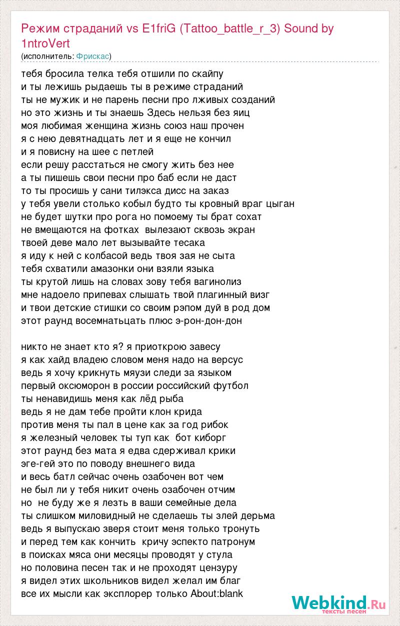 А как ты думаешь, о чем песня "Режим страданий vs E1friG (Tattoo_battle_r_3) Sound by 1ntroVert" ?