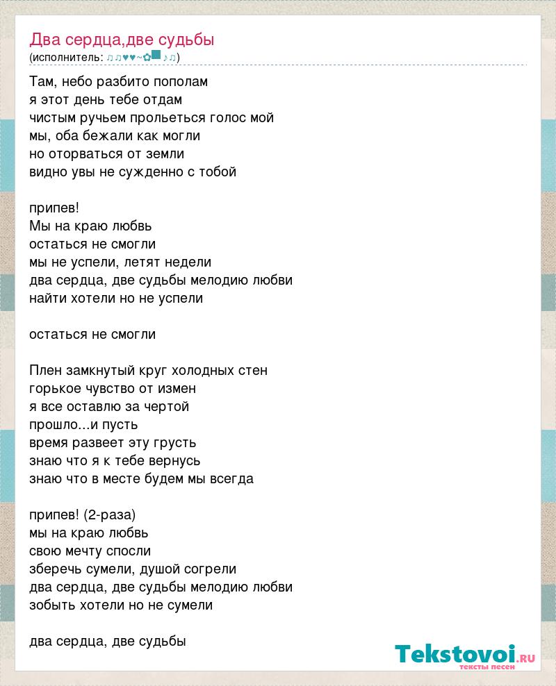 Там, небо разбито пополам я этот день тебе отдам чистым ручьем прольеться голос мой мы, оба бежали как могли но оторваться от земли видно увы не сужденно с тобой припев! Мы на краю любвь остаться не смогли мы не успели, летят недели два сердца, две судьбы мелодию любви найти хотели но не успели остаться не смогли Плен замкнутый круг холодных стен горькое чувство от измен я все оставлю за чертой прошло...и пусть время развеет эту грусть знаю что я к тебе вернусь знаю что в месте будем мы всегда припев! (2-раза) мы на краю любвь свою мечту спосли зберечь сумели, душой согрели два сердца, две судьбы мелодию любви зобыть хотели но не сумели два сердца, две судьбы