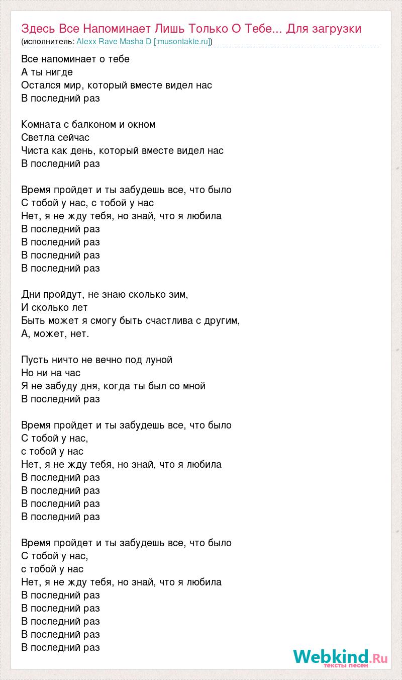 Все напоминает о тебе А ты нигде Остался мир, который вместе видел нас В последний раз Комната с балконом и окном Светла сейчас Чиста как день, который вместе видел нас В последний раз Время пройдет и ты забудешь все, что было С тобой у нас, с тобой у нас Нет, я не жду тебя, но знай, что я любила В последний раз В последний раз В последний раз В последний раз Дни пройдут, не знаю сколько зим, И сколько лет Быть может я смогу быть счастлива с другим, А, может, нет. Пусть ничто не вечно под луной Но ни на час Я не забуду дня, когда ты был со мной В последний раз Время пройдет и ты забудешь все, что было С тобой у нас, с тобой у нас Нет, я не жду тебя, но знай, что я любила В последний раз В последний раз В последний раз В последний раз Время пройдет и ты забудешь все, что было С тобой у нас, с тобой у нас Нет, я не жду тебя, но знай, что я любила В последний раз В последний раз В последний раз В последний раз В последний раз