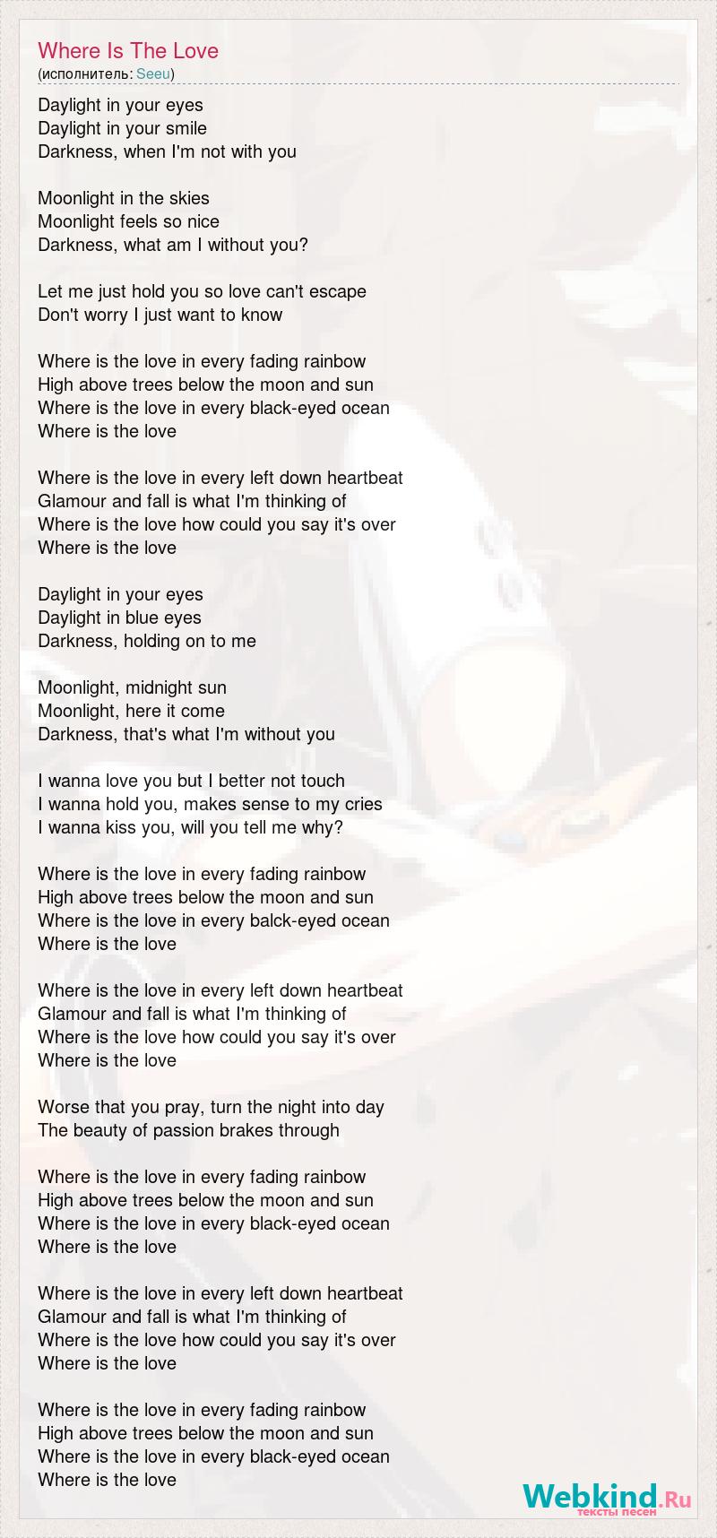 Daylight in your eyes Daylight in your smile Darkness, when I'm not with you Moonlight in the skies Moonlight feels so nice Darkness, what am I without you? Let me just hold you so love can't escape Don't worry I just want to know Where is the love in every fading rainbow High above trees below the moon and sun Where is the love in every black-eyed ocean Where is the love Where is the love in every left down heartbeat Glamour and fall is what I'm thinking of Where is the love how could you say it's over Where is the love Daylight in your eyes Daylight in blue eyes Darkness, holding on to me Moonlight, midnight sun Moonlight, here it come Darkness, that's what I'm without you I wanna love you but I better not touch I wanna hold you, makes sense to my cries I wanna kiss you, will you tell me why? Where is the love in every fading rainbow High above trees below the moon and sun Where is the love in every balck-eyed ocean Where is the love Where is the love in every left down heartbeat Glamour and fall is what I'm thinking of Where is the love how could you say it's over Where is the love Worse that you pray, turn the night into day The beauty of passion brakes through Where is the love in every fading rainbow High above trees below the moon and sun Where is the love in every black-eyed ocean Where is the love Where is the love in every left down heartbeat Glamour and fall is what I'm thinking of Where is the love how could you say it's over Where is the love Where is the love in every fading rainbow High above trees below the moon and sun Where is the love in every black-eyed ocean Where is the love