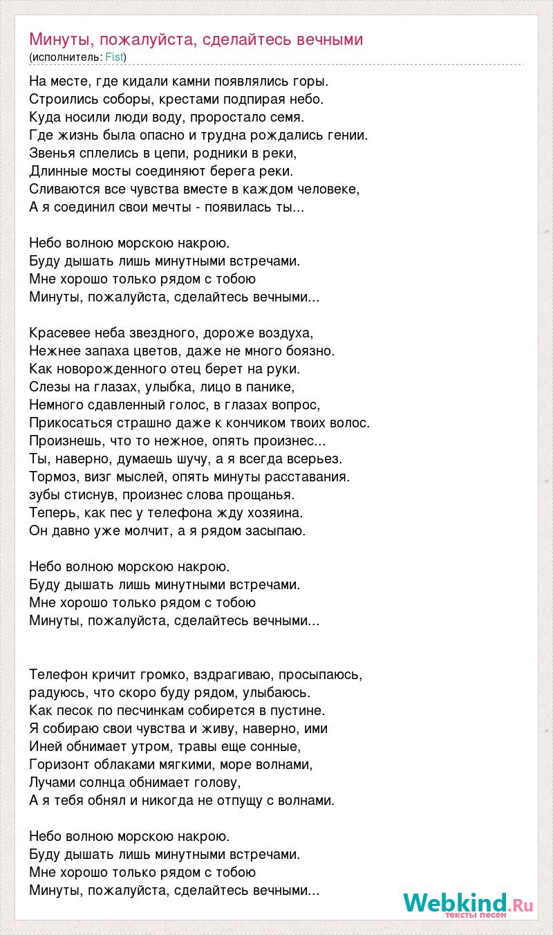 На месте, где кидали камни появлялись горы. Строились соборы, крестами подпирая небо. Куда носили люди воду, проростало семя. Где жизнь была опасно и трудна рождались гении. Звенья сплелись в цепи, родники в реки, Длинные мосты соединяют берега реки. Сливаются все чувства вместе в каждом человеке, А я соединил свои мечты - появилась ты... Небо волною морскою накрою. Буду дышать лишь минутными встречами. Мне хорошо только рядом с тобою Минуты, пожалуйста, сделайтесь вечными... Красевее неба звездного, дороже воздуха, Нежнее запаха цветов, даже не много боязно. Как новорожденного отец берет на руки. Слезы на глазах, улыбка, лицо в панике, Немного сдавленный голос, в глазах вопрос, Прикосаться страшно даже к кончиком твоих волос. Произнешь, что то нежное, опять произнес... Ты, наверно, думаешь шучу, а я всегда всерьез. Тормоз, визг мыслей, опять минуты расставания. зубы стиснув, произнес слова прощанья. Теперь, как пес у телефона жду хозяина. Он давно уже молчит, а я рядом засыпаю. Небо волною морскою накрою. Буду дышать лишь минутными встречами. Мне хорошо только рядом с тобою Минуты, пожалуйста, сделайтесь вечными... Телефон кричит громко, вздрагиваю, просыпаюсь, радуюсь, что скоро буду рядом, улыбаюсь. Как песок по песчинкам собирется в пустине. Я собираю свои чувства и живу, наверно, ими Иней обнимает утром, травы еще сонные, Горизонт облаками мягкими, море волнами, Лучами солнца обнимает голову, А я тебя обнял и никогда не отпущу с волнами. Небо волною морскою накрою. Буду дышать лишь минутными встречами. Мне хорошо только рядом с тобою Минуты, пожалуйста, сделайтесь вечными...