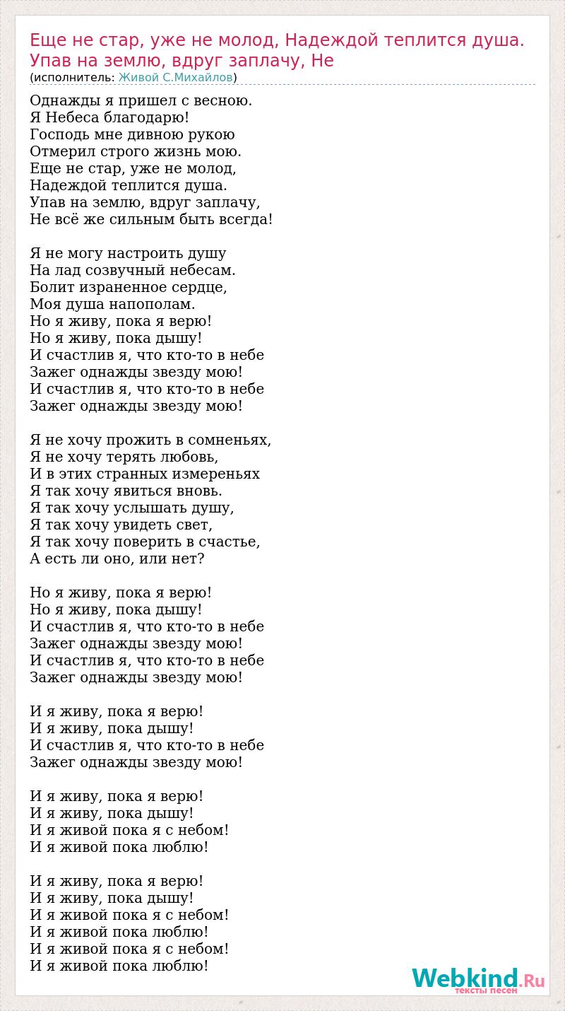 Однажды я пришел с весною. Я Небеса благодарю! Господь мне дивною рукою Отмерил строго жизнь мою. Еще не стар, уже не молод, Надеждой теплится душа. Упав на землю, вдруг заплачу, Не всё же сильным быть всегда! Я не могу настроить душу На лад созвучный небесам. Болит израненное сердце, Моя душа напополам. Но я живу, пока я верю! Но я живу, пока дышу! И счастлив я, что кто-то в небе Зажег однажды звезду мою! И счастлив я, что кто-то в небе Зажег однажды звезду мою! Я не хочу прожить в сомненьях, Я не хочу терять любовь, И в этих странных измереньях Я так хочу явиться вновь. Я так хочу услышать душу, Я так хочу увидеть свет, Я так хочу поверить в счастье, А есть ли оно, или нет? Но я живу, пока я верю! Но я живу, пока дышу! И счастлив я, что кто-то в небе Зажег однажды звезду мою! И счастлив я, что кто-то в небе Зажег однажды звезду мою! И я живу, пока я верю! И я живу, пока дышу! И счастлив я, что кто-то в небе Зажег однажды звезду мою! И я живу, пока я верю! И я живу, пока дышу! И я живой пока я с небом! И я живой пока люблю! И я живу, пока я верю! И я живу, пока дышу! И я живой пока я с небом! И я живой пока люблю! И я живой пока я с небом! И я живой пока люблю!