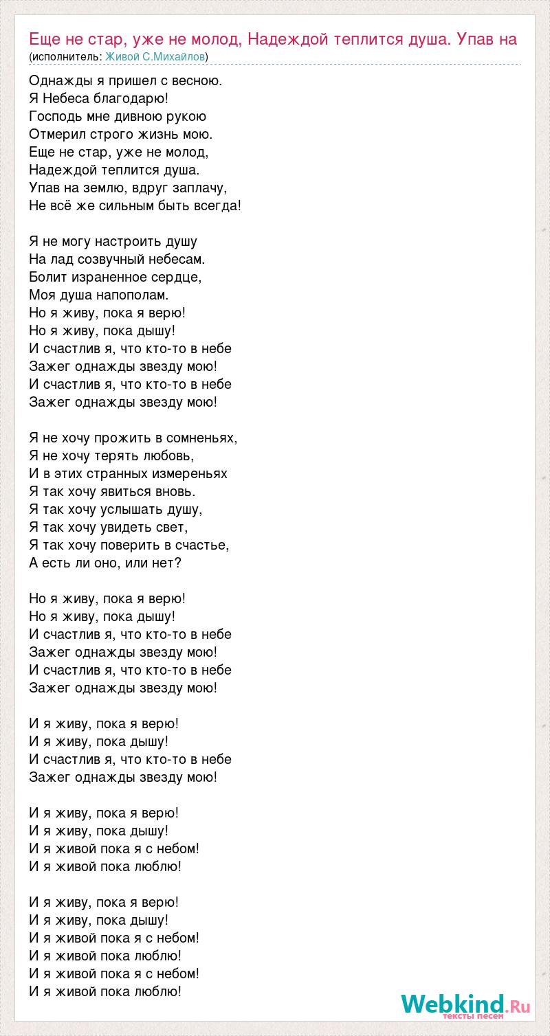 Однажды я пришел с весною. Я Небеса благодарю! Господь мне дивною рукою Отмерил строго жизнь мою. Еще не стар, уже не молод, Надеждой теплится душа. Упав на землю, вдруг заплачу, Не всё же сильным быть всегда! Я не могу настроить душу На лад созвучный небесам. Болит израненное сердце, Моя душа напополам. Но я живу, пока я верю! Но я живу, пока дышу! И счастлив я, что кто-то в небе Зажег однажды звезду мою! И счастлив я, что кто-то в небе Зажег однажды звезду мою! Я не хочу прожить в сомненьях, Я не хочу терять любовь, И в этих странных измереньях Я так хочу явиться вновь. Я так хочу услышать душу, Я так хочу увидеть свет, Я так хочу поверить в счастье, А есть ли оно, или нет? Но я живу, пока я верю! Но я живу, пока дышу! И счастлив я, что кто-то в небе Зажег однажды звезду мою! И счастлив я, что кто-то в небе Зажег однажды звезду мою! И я живу, пока я верю! И я живу, пока дышу! И счастлив я, что кто-то в небе Зажег однажды звезду мою! И я живу, пока я верю! И я живу, пока дышу! И я живой пока я с небом! И я живой пока люблю! И я живу, пока я верю! И я живу, пока дышу! И я живой пока я с небом! И я живой пока люблю! И я живой пока я с небом! И я живой пока люблю!