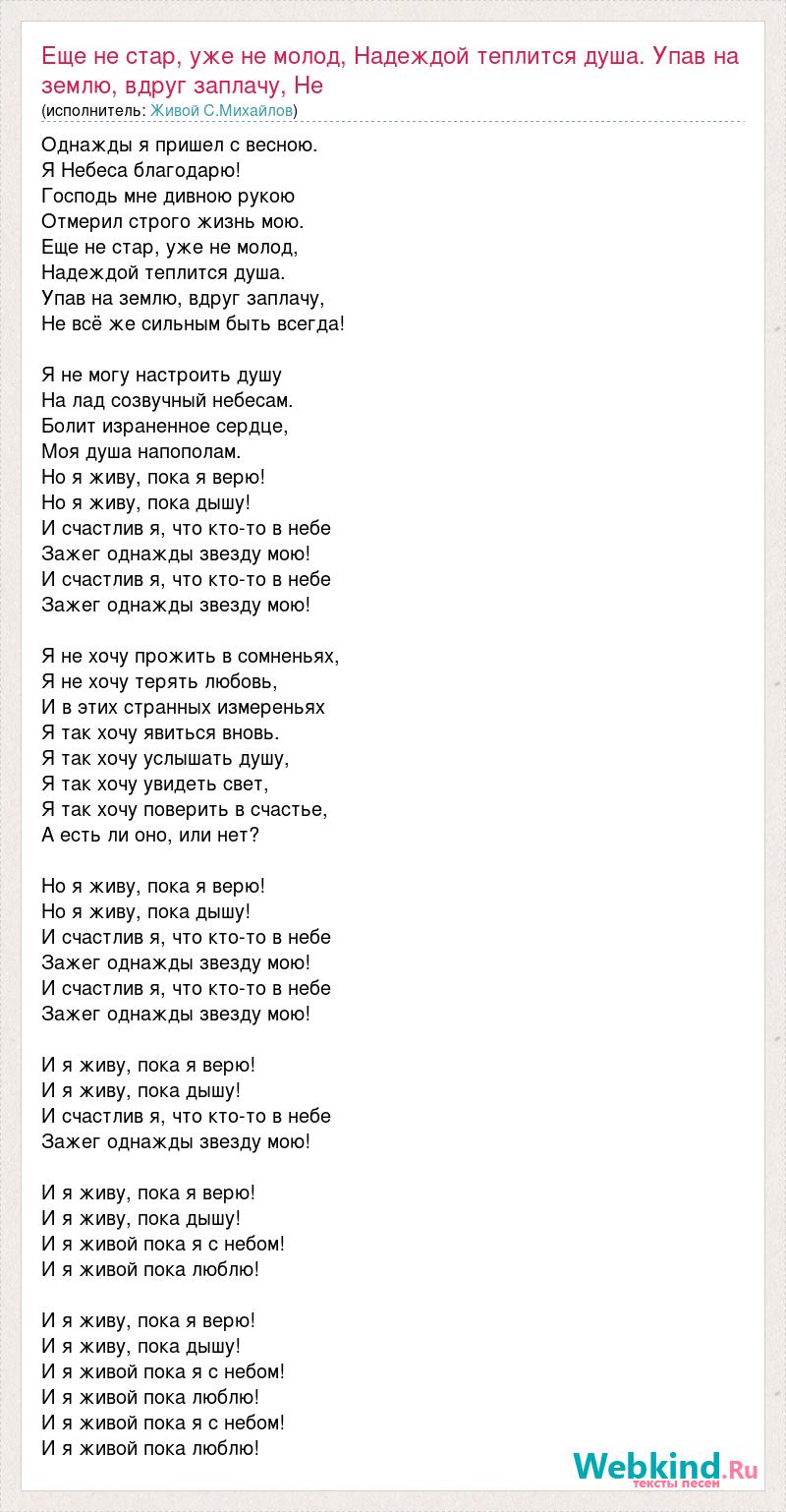 Однажды я пришел с весною. Я Небеса благодарю! Господь мне дивною рукою Отмерил строго жизнь мою. Еще не стар, уже не молод, Надеждой теплится душа. Упав на землю, вдруг заплачу, Не всё же сильным быть всегда! Я не могу настроить душу На лад созвучный небесам. Болит израненное сердце, Моя душа напополам. Но я живу, пока я верю! Но я живу, пока дышу! И счастлив я, что кто-то в небе Зажег однажды звезду мою! И счастлив я, что кто-то в небе Зажег однажды звезду мою! Я не хочу прожить в сомненьях, Я не хочу терять любовь, И в этих странных измереньях Я так хочу явиться вновь. Я так хочу услышать душу, Я так хочу увидеть свет, Я так хочу поверить в счастье, А есть ли оно, или нет? Но я живу, пока я верю! Но я живу, пока дышу! И счастлив я, что кто-то в небе Зажег однажды звезду мою! И счастлив я, что кто-то в небе Зажег однажды звезду мою! И я живу, пока я верю! И я живу, пока дышу! И счастлив я, что кто-то в небе Зажег однажды звезду мою! И я живу, пока я верю! И я живу, пока дышу! И я живой пока я с небом! И я живой пока люблю! И я живу, пока я верю! И я живу, пока дышу! И я живой пока я с небом! И я живой пока люблю! И я живой пока я с небом! И я живой пока люблю!