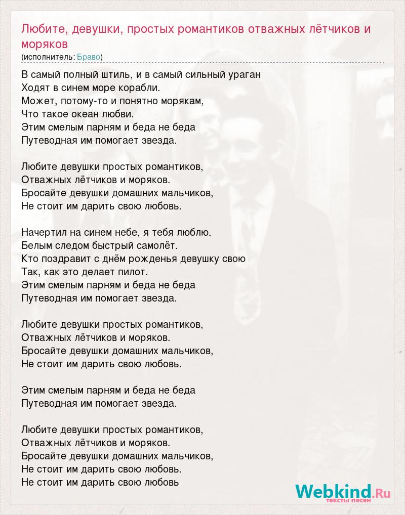 В самый полный штиль, и в самый сильный ураган Ходят в синем море корабли. Может, потому-то и понятно морякам, Что такое океан любви. Этим смелым парням и беда не беда Путеводная им помогает звезда. Любите девушки простых романтиков, Отважных лётчиков и моряков. Бросайте девушки домашних мальчиков, Не стоит им дарить свою любовь. Начертил на синем небе, я тебя люблю. Белым следом быстрый самолёт. Кто поздравит с днём рожденья девушку свою Так, как это делает пилот. Этим смелым парням и беда не беда Путеводная им помогает звезда. Любите девушки простых романтиков, Отважных лётчиков и моряков. Бросайте девушки домашних мальчиков, Не стоит им дарить свою любовь. Этим смелым парням и беда не беда Путеводная им помогает звезда. Любите девушки простых романтиков, Отважных лётчиков и моряков. Бросайте девушки домашних мальчиков, Не стоит им дарить свою любовь. Не стоит им дарить свою любовь