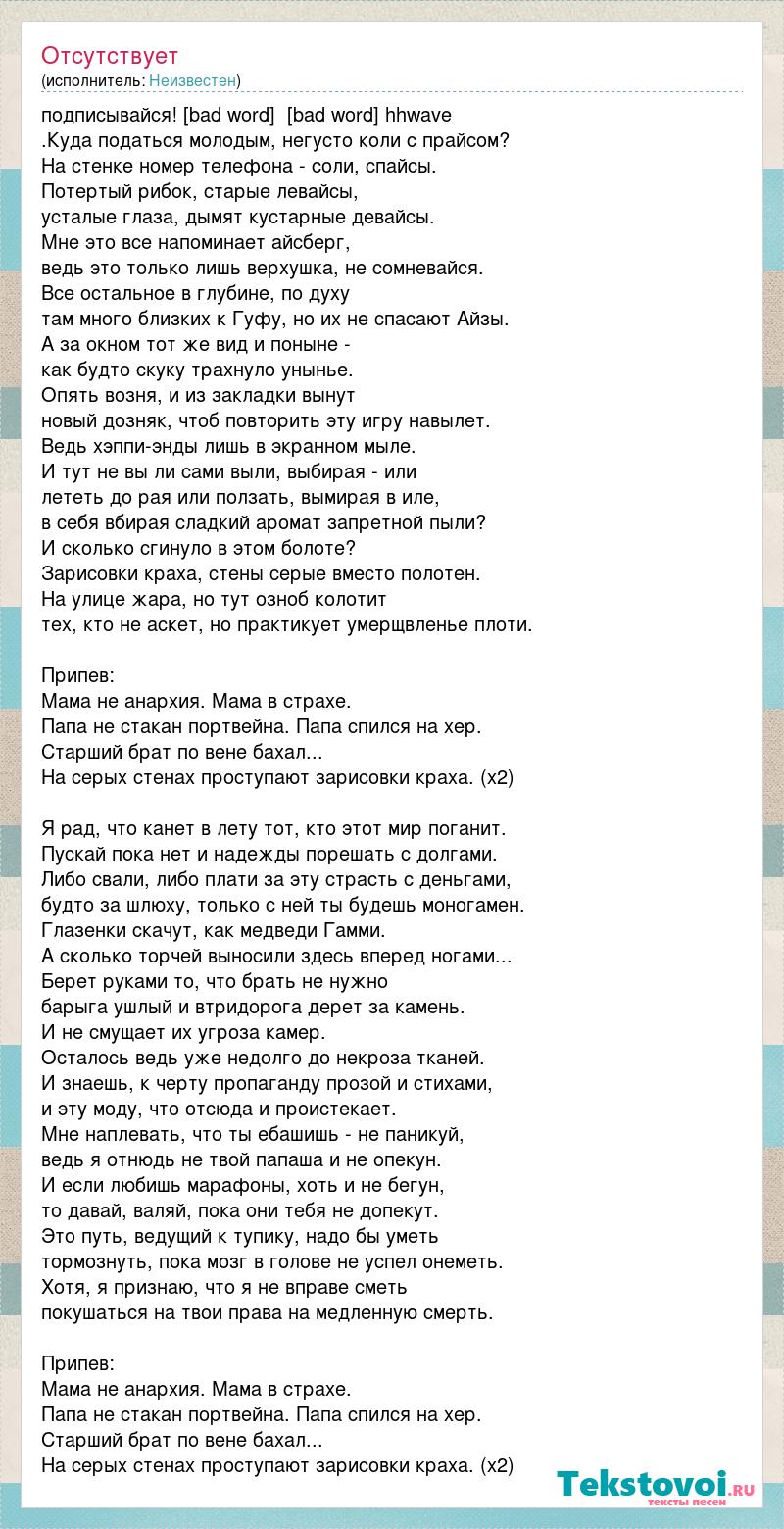 подписывайся! [bad word] [bad word] hhwave .Куда податься молодым, негусто коли с прайсом? На стенке номер телефона - соли, спайсы. Потертый рибок, старые левайсы, усталые глаза, дымят кустарные девайсы. Мне это все напоминает айсберг, ведь это только лишь верхушка, не сомневайся. Все остальное в глубине, по духу там много близких к Гуфу, но их не спасают Айзы. А за окном тот же вид и поныне - как будто скуку трахнуло унынье. Опять возня, и из закладки вынут новый дозняк, чтоб повторить эту игру навылет. Ведь хэппи-энды лишь в экранном мыле. И тут не вы ли сами выли, выбирая - или лететь до рая или ползать, вымирая в иле, в себя вбирая сладкий аромат запретной пыли? И сколько сгинуло в этом болоте? Зарисовки краха, стены серые вместо полотен. На улице жара, но тут озноб колотит тех, кто не аскет, но практикует умерщвленье плоти. Припев: Мама не анархия. Мама в страхе. Папа не стакан портвейна. Папа спился на хер. Старший брат по вене бахал... На серых стенах проступают зарисовки краха. (х2) Я рад, что канет в лету тот, кто этот мир поганит. Пускай пока нет и надежды порешать с долгами. Либо свали, либо плати за эту страсть с деньгами, будто за шлюху, только с ней ты будешь моногамен. Глазенки скачут, как медведи Гамми. А сколько торчей выносили здесь вперед ногами... Берет руками то, что брать не нужно барыга ушлый и втридорога дерет за камень. И не смущает их угроза камер. Осталось ведь уже недолго до некроза тканей. И знаешь, к черту пропаганду прозой и стихами, и эту моду, что отсюда и проистекает. Мне наплевать, что ты ебашишь - не паникуй, ведь я отнюдь не твой папаша и не опекун. И если любишь марафоны, хоть и не бегун, то давай, валяй, пока они тебя не допекут. Это путь, ведущий к тупику, надо бы уметь тормознуть, пока мозг в голове не успел онеметь. Хотя, я признаю, что я не вправе сметь покушаться на твои права на медленную смерть. Припев: Мама не анархия. Мама в страхе. Папа не стакан портвейна. Папа спился на хер. Старший брат по вене бахал... На серых стенах проступают зарисовки краха. (х2)