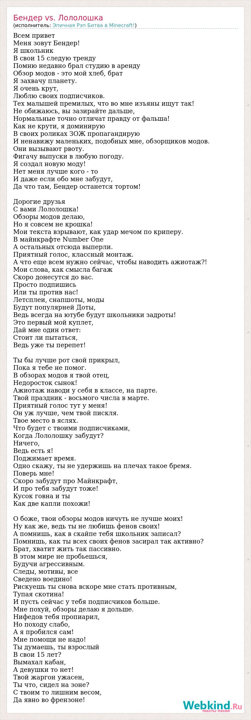 Всем привет Меня зовут Бендер! Я школьник В свои 15 следую тренду Помню недавно брал студию в аренду Обзор модов - это мой хлеб, брат Я захвачу планету. Я очень крут, Люблю своих подписчиков. Тех малышей премилых, что во мне изъяны ищут так! Не обижаюсь, вы зазирайте дальше, Нормальные точно отличат правду от фальша! Как не крути, я доминирую В своих роликах ЗОЖ пропагандирую И ненавижу маленьких, подобных мне, обзорщиков модов. Они вызывают рвоту. Фигачу выпуски в любую погоду. Я создал новую моду! Нет меня лучше кого - то И даже если обо мне забудут, Да что там, Бендер останется тортом! Дорогие друзья С вами Лололошка! Обзоры модов делаю, Но я совсем не крошка! Мои текста взрывают, как удар мечом по криперу. В майнкрафте Number One А остальных отсюда выперли. Приятный голос, классный монтаж. А что еще всем нужно сейчас, чтобы наводить ажиотаж?! Мои слова, как смысла багаж Скоро донесутся до вас. Просто подпишись Или ты против нас! Летсплеи, снапшоты, моды Будут популярней Доты, Ведь всегда на ютубе будут школьники задроты! Это первый мой куплет, Дай мне один ответ: Стоит ли пытаться, Ведь уже ты перепет! Ты бы лучше рот свой прикрыл, Пока я тебе не помог. В обзорах модов я твой отец, Недоросток сынок! Ажиотаж наводи у себя в классе, на парте. Твой праздник - восьмого числа в марте. Приятный голос тут у меня! Он уж лучше, чем твой пискля. Твое место в яслях. Что будет с твоими подписчиками, Когда Лололошку забудут? Ничего, Ведь есть я! Поджимает время. Одно скажу, ты не удержишь на плечах такое бремя. Поверь мне! Скоро забудут про Майнкрафт, И про тебя забудут тоже! Кусок говна и ты Как две капли похожи! О боже, твои обзоры модов ничуть не лучше моих! Ну как же, ведь ты не любишь фенов своих! А помнишь, как в скайпе тебя школьник записал? Помнишь, как ты всех своих фенов засирал так активно? Брат, хватит жить так пассивно. В этом мире не пробьешься, Будучи агрессивным. Следы, мотивы, все Сведено воедино! Рискуешь ты снова вскоре мне стать противным, Тупая скотина! И пусть сейчас у тебя подписчиков больше. Мне похуй, обзоры делаю я дольше. Нифедов тебя пропиарил, Но походу слабо, А я пробился сам! Мне помощи не надо! Ты думаешь, ты взрослый В свои 15 лет? Вымахал кабан, А девушки то нет! Твой жаргон ужасен, Ты что, сидел на зоне? С твоим то лишним весом, Да явно во френзоне!