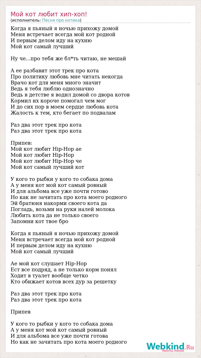 Когда я пьяный я ночью прихожу домой Меня встречает всегда мой кот родной И первым делом иду на кухню Мой кот самый лучший Ну че...про тебя же бл*ть читаю, не мешай А ее разбавит этот трек про кота Про политику любовь мне читать некогда Врачо кот для меня много значит Ведь я тебя люблю однозначно Ведь в детстве я водил домой со двора котов Кормил их короче помогал чем мог И до сих пор в моем сердце любовь кота Жалость к тем, кто бегает по подвалам Раз два этот трек про кота Раз два этот трек про кота Припев: Мой кот любит Hip-Hop ае Мой кот любит Hip-Hop Мой кот любит Hip-Hop че Мой кот самый лучший кот У кого то рыбки у кого то собака дома А у меня кот мой кот самый ровный И для альбома все уже почти готово Но как не зачитать про кота моего родного Эй братюня накорми своего кота да Погладь, возьми на руки налей молока Любить кота да не только своего Запомни кот твое бро Когда я пьяный я ночью прихожу домой Меня встречает всегда мой кот родной И первым делом иду на кухню Мой кот самый лучший Ае мой кот слушает Hip-Hop Ест все подряд, а не только корм понял Ходит в туалет вообще четко Кто обижает котов всех дур за решетку Раз два этот трек про кота Раз два этот трек про кота Припев У кого то рыбки у кого то собака дома А у меня кот мой кот самый ровный И для альбома все уже почти готова Но как не зачитать про кота моего родного