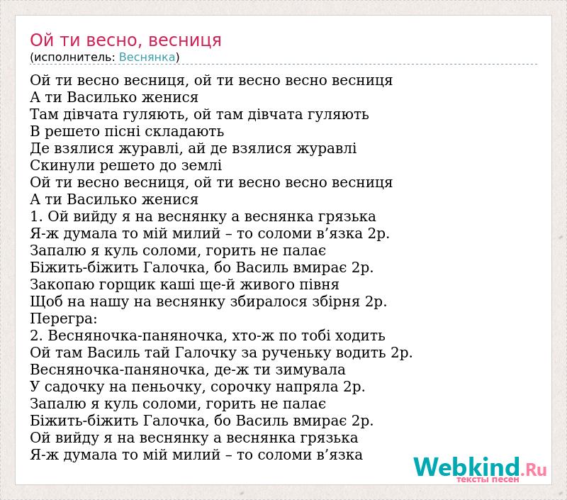 Ой ти весно весниця, ой ти весно весно весниця А ти Василько женися Там дівчата гуляють, ой там дівчата гуляють В решето пісні складають Де взялися журавлі, ай де взялися журавлі Скинули решето до землі Ой ти весно весниця, ой ти весно весно весниця А ти Василько женися 1. Ой вийду я на веснянку а веснянка грязька Я-ж думала то мій милий – то соломи в’язка 2р. Запалю я куль соломи, горить не палає Біжить-біжить Галочка, бо Василь вмирає 2р. Закопаю горщик каші ще-й живого півня Щоб на нашу на веснянку збиралося збірня 2р. Перегра: 2. Весняночка-паняночка, хто-ж по тобі ходить Ой там Василь тай Галочку за рученьку водить 2р. Весняночка-паняночка, де-ж ти зимувала У садочку на пеньочку, сорочку напряла 2р. Запалю я куль соломи, горить не палає Біжить-біжить Галочка, бо Василь вмирає 2р. Ой вийду я на веснянку а веснянка грязька Я-ж думала то мій милий – то соломи в’язка