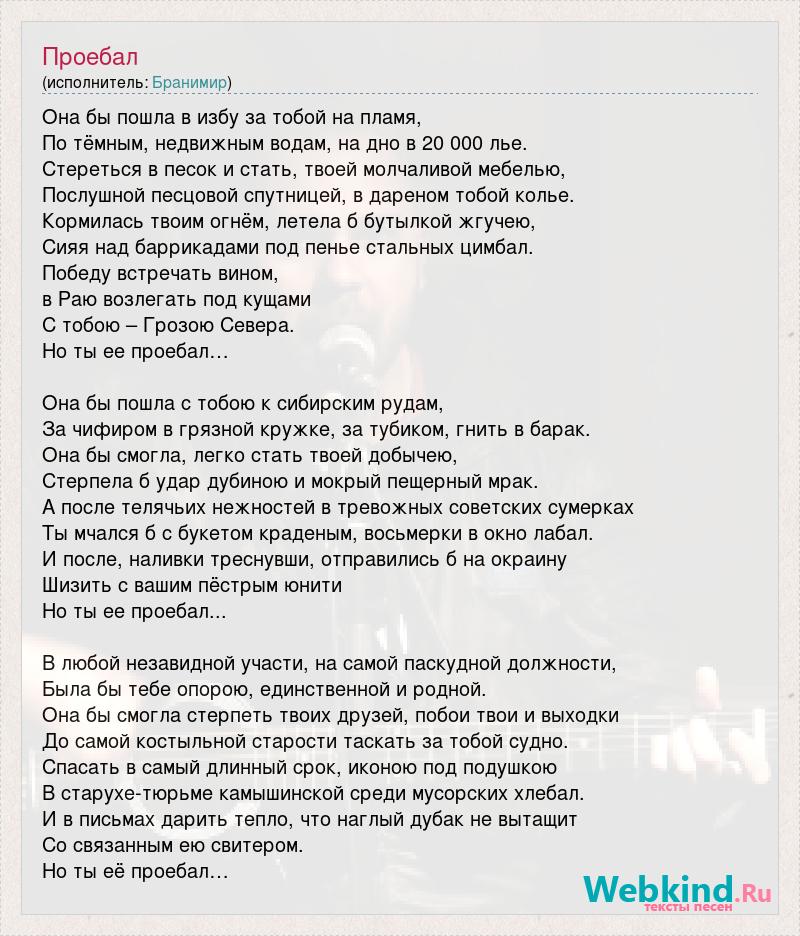 Она бы пошла в избу за тобой на пламя, По тёмным, недвижным водам, на дно в 20 000 лье. Стереться в песок и стать, твоей молчаливой мебелью, Послушной песцовой спутницей, в дареном тобой колье. Кормилась твоим огнём, летела б бутылкой жгучею, Сияя над баррикадами под пенье стальных цимбал. Победу встречать вином, в Раю возлегать под кущами С тобою – Грозою Севера. Но ты ее проебал… Она бы пошла с тобою к сибирским рудам, За чифиром в грязной кружке, за тубиком, гнить в барак. Она бы смогла, легко стать твоей добычею, Стерпела б удар дубиною и мокрый пещерный мрак. А после телячьих нежностей в тревожных советских сумерках Ты мчался б с букетом краденым, восьмерки в окно лабал. И после, наливки треснувши, отправились б на окраину Шизить с вашим пёстрым юнити Но ты ее проебал... В любой незавидной участи, на самой паскудной должности, Была бы тебе опорою, единственной и родной. Она бы смогла стерпеть твоих друзей, побои твои и выходки До самой костыльной старости таскать за тобой судно. Спасать в самый длинный срок, иконою под подушкою В старухе-тюрьме камышинской среди мусорских хлебал. И в письмах дарить тепло, что наглый дубак не вытащит Со связанным ею свитером. Но ты её проебал…
