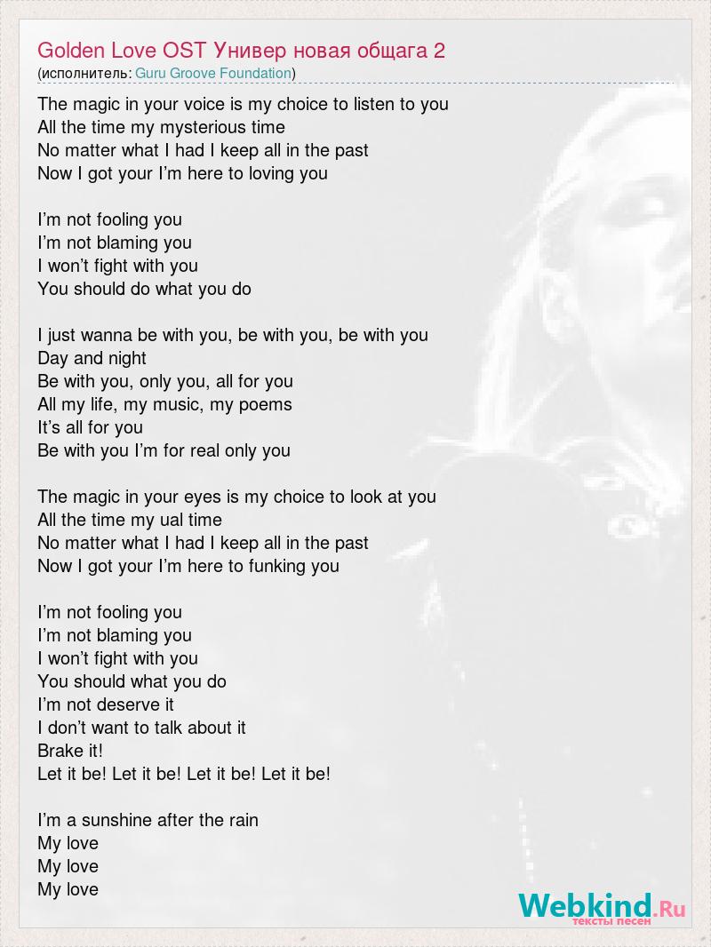 The magic in your voice is my choice to listen to you All the time my mysterious time No matter what I had I keep all in the past Now I got your I’m here to loving you I’m not fooling you I’m not blaming you I won’t fight with you You should do what you do I just wanna be with you, be with you, be with you Day and night Be with you, only you, all for you All my life, my music, my poems It’s all for you Be with you I’m for real only you The magic in your eyes is my choice to look at you All the time my ual time No matter what I had I keep all in the past Now I got your I’m here to funking you I’m not fooling you I’m not blaming you I won’t fight with you You should what you do I’m not deserve it I don’t want to talk about it Brake it! Let it be! Let it be! Let it be! Let it be! I’m a sunshine after the rain My love My love My love
