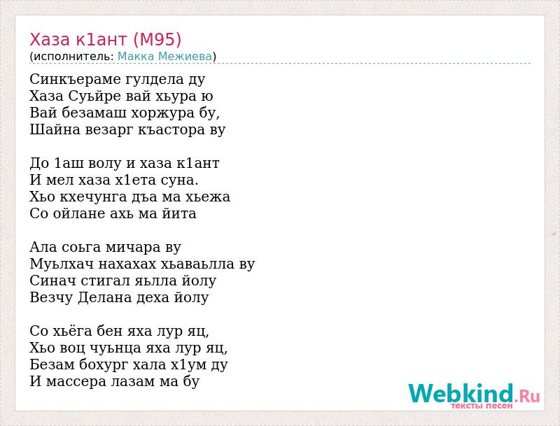 Синкъераме гулдела ду Хаза Суьйре вай хьура ю Вай безамаш хоржура бу, Шайна везарг къастора ву До 1аш волу и хаза к1ант И мел хаза х1ета суна. Хьо кхечунга дъа ма хьежа Со ойлане ахь ма йита Ала соьга мичара ву Муьлхач нахахах хьаваьлла ву Синач стигал яьлла йолу Везчу Делана деха йолу Со хьёга бен яха лур яц, Хьо воц чуьнца яха лур яц, Безам бохург хала х1ум ду И массера лазам ма бу