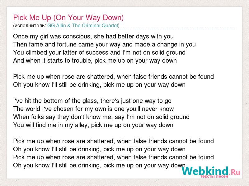 Once my girl was conscious, she had better days with you Then fame and fortune came your way and made a change in you You climbed your latter of success and I'm not on solid ground And when it starts to trouble, pick me up on your way down Pick me up when rose are shattered, when false friends cannot be found Oh you know I'll still be drinking, pick me up on your way down I've hit the bottom of the glass, there's just one way to go The world I've chosen for my own is one you'll never know When folks say they don't know me, say I'm not on solid ground You will find me in my alley, pick me up on your way down Pick me up when rose are shattered, when false friends cannot be found Oh you know I'll still be drinking, pick me up on your way down Pick me up when rose are shattered, when false friends cannot be found Oh you know I'll still be drinking, pick me up on your way down