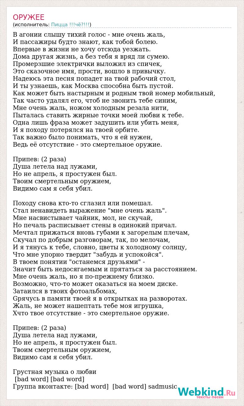 В агонии слышу тихий голос - мне очень жаль, И пассажиры будто знают, как тобой болею. Впервые в жизни не хочу отсюда уезжать. Дома другая жизнь, а без тебя я вряд ли сумею. Промерзшие электрички выложил из спичек, Это сказочное имя, прости, вошло в привычку. Надеюсь эта песня попадет на твой рабочий стол, И ты узнаешь, как Москва способна быть пустой. Как может быть настырным и родным твой номер мобильный, Так часто удалял его, чтоб не звонить тебе синим, Мне очень жаль, ножом холодным резала нити, Пыталась ставить жирные точки моей любви к тебе. Одна лишь фраза может задушить или убить меня, И я походу потерялся на твоей орбите. Так важно было понимать, что я ей нужен, Ведь её отсутствие - это смертельное оружие. Припев: (2 раза) Душа летела над лужами, Но не апрель, я простужен был. Твоим смертельным оружием, Видимо сам я себя убил. Походу снова кто-то сглазил или помешал. Стал ненавидеть выражение "мне очень жаль". Мне насвистывает чайник, мол, не скучай, Но печаль расписывает стены в одинокий причал. Мечтал прижаться вновь губами к загорелым плечам, Скучал по добрым разговорам, так, по мелочам, И я тянусь к тебе, словно, цветы к холодному солнцу, Что мне упорно твердит "забудь и успокойся". В твоем понятии "останемся друзьями" - Значит быть недосягаемым и прятаться за расстоянием. Мне очень жаль, но я по-прежнему близко. Возможно, что-то может оказаться на моем диске. Затаился в твоих фотоальбомах, Gрячусь в памяти твоей я в открытках на разворотах. Жаль, не может нашептать тебе моя игрушка, Xчто твое отсутствие - это смертельное оружие. Припев: (2 раза) Душа летела над лужами, Но не апрель, я простужен был. Твоим смертельным оружием, Видимо сам я себя убил. Грустная музыка о любви [bad word] [bad word] Группа вконтакте: [bad word] [bad word] sadmusic