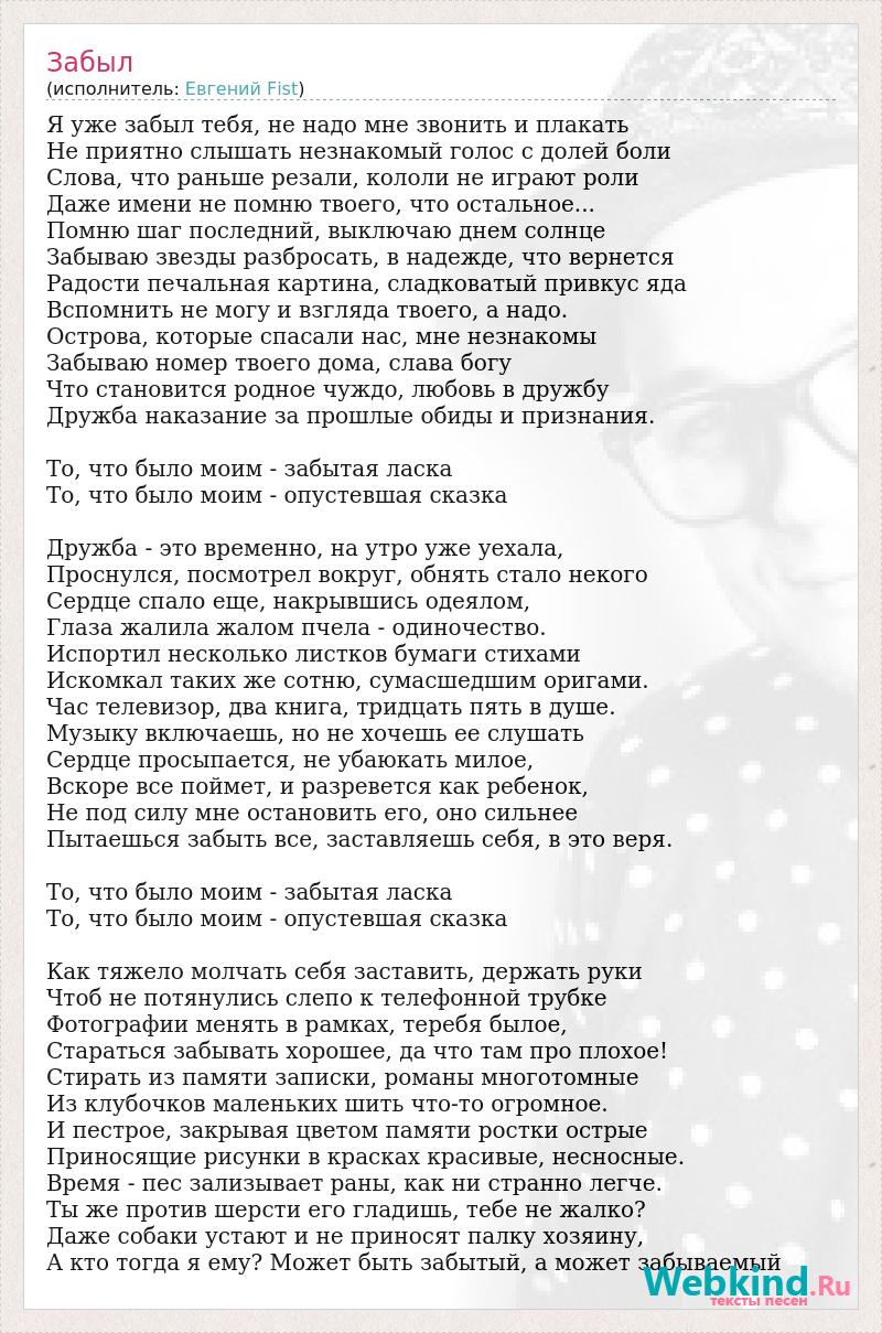 Я уже забыл тебя, не надо мне звонить и плакать Не приятно слышать незнакомый голос с долей боли Слова, что раньше резали, кололи не играют роли Даже имени не помню твоего, что остальное... Помню шаг последний, выключаю днем солнце Забываю звезды разбросать, в надежде, что вернется Радости печальная картина, сладковатый привкус яда Вспомнить не могу и взгляда твоего, а надо. Острова, которые спасали нас, мне незнакомы Забываю номер твоего дома, слава богу Что становится родное чуждо, любовь в дружбу Дружба наказание за прошлые обиды и признания. То, что было моим - забытая ласка То, что было моим - опустевшая сказка Дружба - это временно, на утро уже уехала, Проснулся, посмотрел вокруг, обнять стало некого Сердце спало еще, накрывшись одеялом, Глаза жалила жалом пчела - одиночество. Испортил несколько листков бумаги стихами Искомкал таких же сотню, сумасшедшим оригами. Час телевизор, два книга, тридцать пять в душе. Музыку включаешь, но не хочешь ее слушать Сердце просыпается, не убаюкать милое, Вскоре все поймет, и разревется как ребенок, Не под силу мне остановить его, оно сильнее Пытаешься забыть все, заставляешь себя, в это веря. То, что было моим - забытая ласка То, что было моим - опустевшая сказка Как тяжело молчать себя заставить, держать руки Чтоб не потянулись слепо к телефонной трубке Фотографии менять в рамках, теребя былое, Стараться забывать хорошее, да что там про плохое! Стирать из памяти записки, романы многотомные Из клубочков маленьких шить что-то огромное. И пестрое, закрывая цветом памяти ростки острые Приносящие рисунки в красках красивые, несносные. Время - пес зализывает раны, как ни странно легче. Ты же против шерсти его гладишь, тебе не жалко? Даже собаки устают и не приносят палку хозяину, А кто тогда я ему? Может быть забытый, а может забываемый